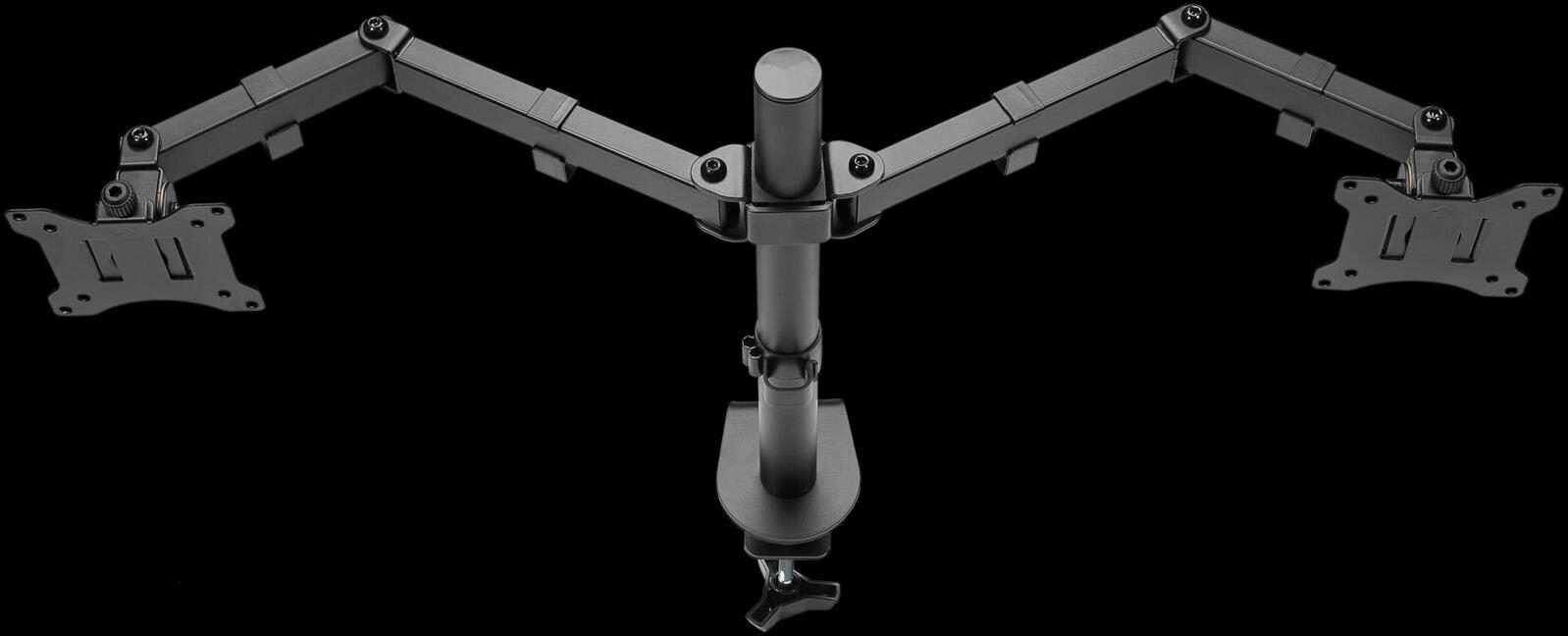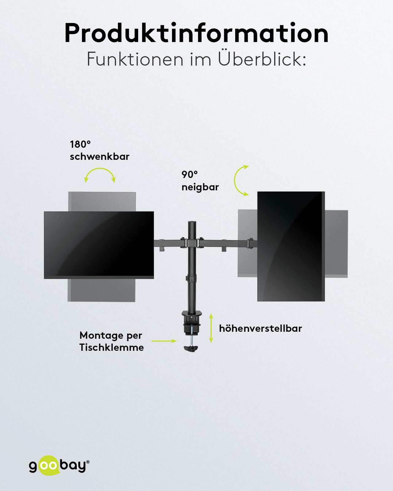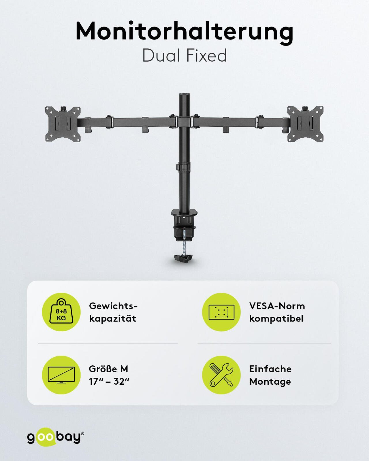 Die goobay Monitor-Halterung Dual Flex in elegantem Schwarz ist die ideale Lösung für alle, die ihre Arbeitsumgebung optimieren möchten. Hergestellt aus robustem Stahl bietet diese Halterung nicht nur Stabilität, sondern auch eine lange Lebensdauer. Mit einer VESA-Platte von 1,5 mm Stärke ist sie besonders widerstandsfähig und sorgt dafür, dass Ihre Monitore sicher und fest an ihrem Platz bleiben. Diese Halterung ist speziell für die Verwendung von zwei Monitoren konzipiert, was Ihnen ermöglicht, Ihre Produktivität erheblich zu steigern. Egal, ob Sie im Homeoffice arbeiten, kreative Projekte umsetzen oder einfach nur mehr Bildschirmfläche für Multitasking benötigen, die Dual Flex Halterung wird Ihren Anforderungen gerecht. Durch die Tischklemme lässt sich die Halterung einfach und schnell an jedem Tisch oder Schreibtisch montieren, ohne dabei die Oberfläche zu beschädigen. Die schwarze Farbgebung der Halterung fügt sich harmonisch in jede Büroeinrichtung ein und sorgt für einen modernen Look. Darüber hinaus ermöglicht die flexible Konstruktion eine individuelle Anpassung der Monitore, sodass Sie stets die optimale Sicht auf Ihre Inhalte haben. Durch die Möglichkeit, die Monitore in der Höhe und im Winkel zu verstellen, können Sie eine ergonomische Arbeitsposition einnehmen, die Nacken- und Rückenschmerzen vorbeugt. Die goobay Monitor-Halterung Dual Flex ist nicht nur funktional, sondern auch eine stilvolle Ergänzung für Ihr Büro oder Ihren Arbeitsplatz. Mit dieser Halterung profitieren Sie von einer verbesserten Arbeitsorganisation und einem aufgeräumten Schreibtisch, da Kabel und Monitore effizient verwaltet werden können. Verleihen Sie Ihrem Arbeitsbereich mit dieser praktischen und eleganten Lösung den letzten Schliff.Technische Daten