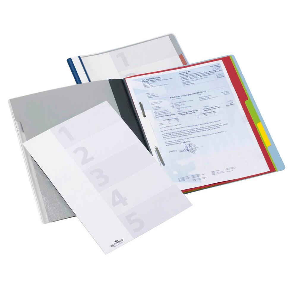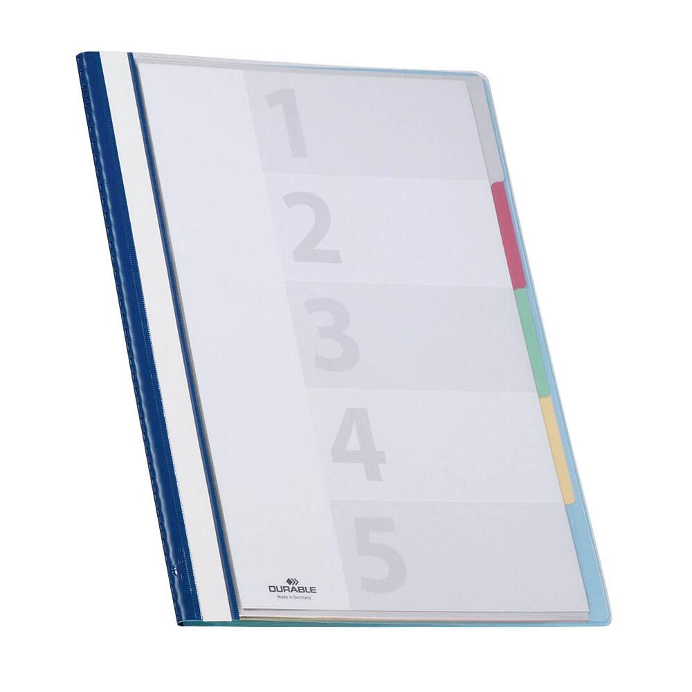 Der DURABLE DIVISOFLEX Organisationshefter in Blau ist die ideale Lösung für eine übersichtliche und strukturierte Ablage deiner Dokumente im DIN A4 Format. Mit fünf praktischen Unterteilungen und separaten Heftmechaniken ermöglicht dieser Schnellhefter eine individuelle Organisation, die sich perfekt an deine Bedürfnisse anpasst. Die klare Gliederung sorgt dafür, dass du jederzeit schnell auf die benötigten Informationen zugreifen kannst, ohne lange suchen zu müssen. Ein besonderes Highlight des DURABLE DIVISOFLEX ist die Möglichkeit, das Deckblatt unkompliziert zu beschriften. Du kannst es einfach in die transparente Vordertasche einschieben, was dir erlaubt, die Inhalte auf einen Blick zu identifizieren. Dies ist besonders nützlich, wenn du mehrere Hefter verwendest und eine schnelle Zuordnung erforderlich ist. Darüber hinaus bietet der Organisationshefter die Option zur Erweiterung mit einer Hängeschiene, wodurch er sich hervorragend für die Ablage in einer Hängeregistratur eignet. Dies sorgt für zusätzlichen Komfort und Platzersparnis in deinem Büro oder Arbeitsbereich. Der DURABLE DIVISOFLEX ist aus hochwertigem Polyvinylchlorid (PVC) gefertigt, was ihm eine hohe Langlebigkeit und Widerstandsfähigkeit verleiht. Die ansprechende blaue Farbe sorgt nicht nur für eine professionelle Optik, sondern hebt auch deine Unterlagen hervor. Mit einer Innentasche an der Vorderseite bietet der Hefter zudem zusätzlichen Stauraum für lose Blätter oder wichtige Notizen. Insgesamt ist der DURABLE DIVISOFLEX Organisationshefter die perfekte Wahl für alle, die Wert auf Ordnung und Übersichtlichkeit legen. Egal ob im Büro, in der Schule oder zu Hause – dieser Schnellhefter wird deinen Anforderungen gerecht und unterstützt dich dabei, deine Dokumente effizient zu verwalten.Technische Daten