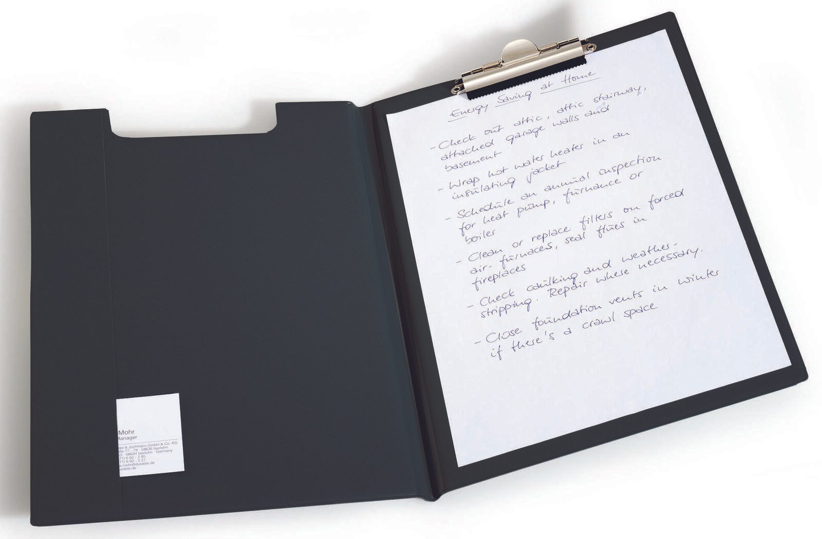 Die DURABLE Klemmbrettmappe DIN A4 in elegantem Schwarz vereint Funktionalität und ansprechendes Design in einem praktischen Produkt. Diese Klemmbrettmappe ist speziell für das Format DIN A4 konzipiert und bietet dir die Möglichkeit, bis zu 75 Blatt sicher und ordentlich zu verwahren. Mit den Maßen von 23,5 x 33,0 cm passt sie perfekt in jede Aktentasche oder jeden Rucksack, sodass du sie überallhin mitnehmen kannst. Hergestellt aus hochwertigem Kunststoff, ist die Klemmbrettmappe nicht nur leicht, sondern auch äußerst robust. Der stabile Metallclip auf der kurzen Seite sorgt dafür, dass deine Dokumente festgehalten werden, ohne dass sie verrutschen oder beschädigt werden. Der schlichte Farbton Schwarz verleiht der Mappe eine zeitlose Eleganz und macht sie zu einem idealen Begleiter für Meetings, Präsentationen oder den Schulalltag. Die DURABLE Klemmbrettmappe ist nicht nur praktisch, sondern auch umweltfreundlich, da sie aus langlebigen Materialien gefertigt ist, die eine lange Lebensdauer gewährleisten. Die Kombination aus Funktionalität und stilvollem Design macht diese Klemmbrettmappe zu einem unverzichtbaren Accessoire für jeden, der Wert auf Ordnung und Professionalität legt. Egal ob im Büro, in der Schule oder bei Veranstaltungen, mit dieser Klemmbrettmappe hast du immer alles im Griff.Technische Daten