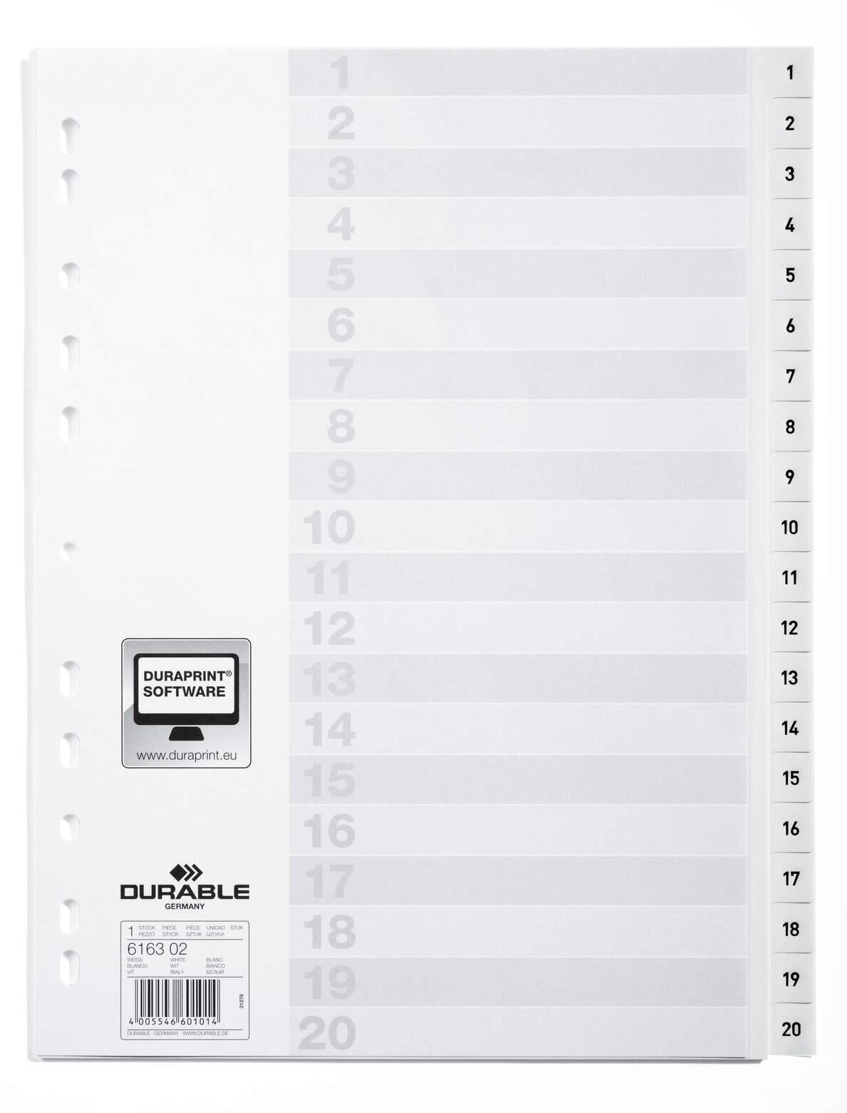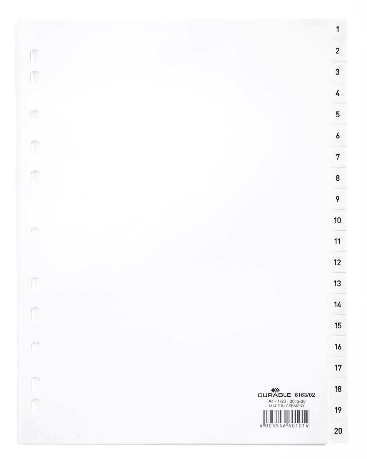 Das DURABLE Ordnerregister ist die ideale Lösung für eine übersichtliche und strukturierte Ablage deiner Unterlagen. Mit insgesamt 20 geprägten Tabs, die von 1 bis 20 nummeriert sind, kannst du deine Dokumente ganz einfach nach Kategorien unterteilen. So behältst du jederzeit den Überblick und findest gesuchte Informationen im Handumdrehen.