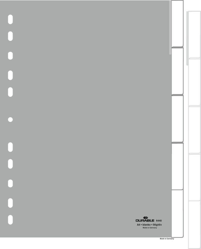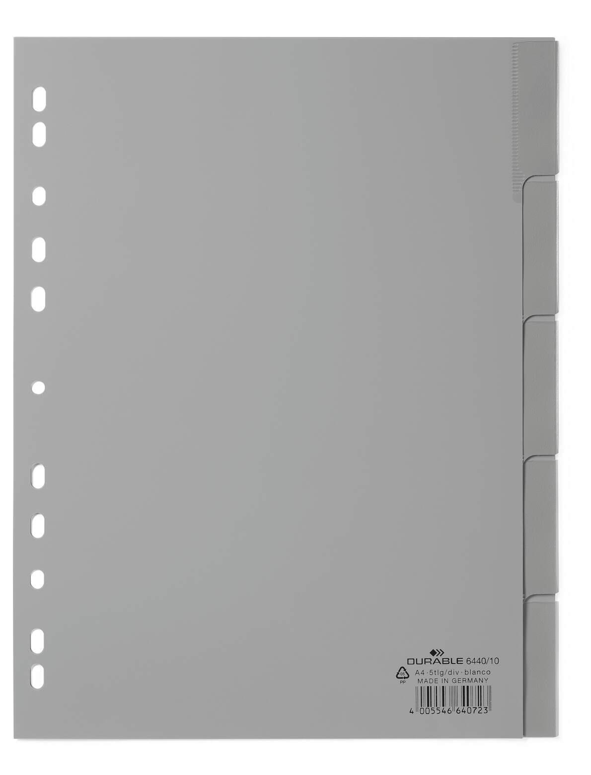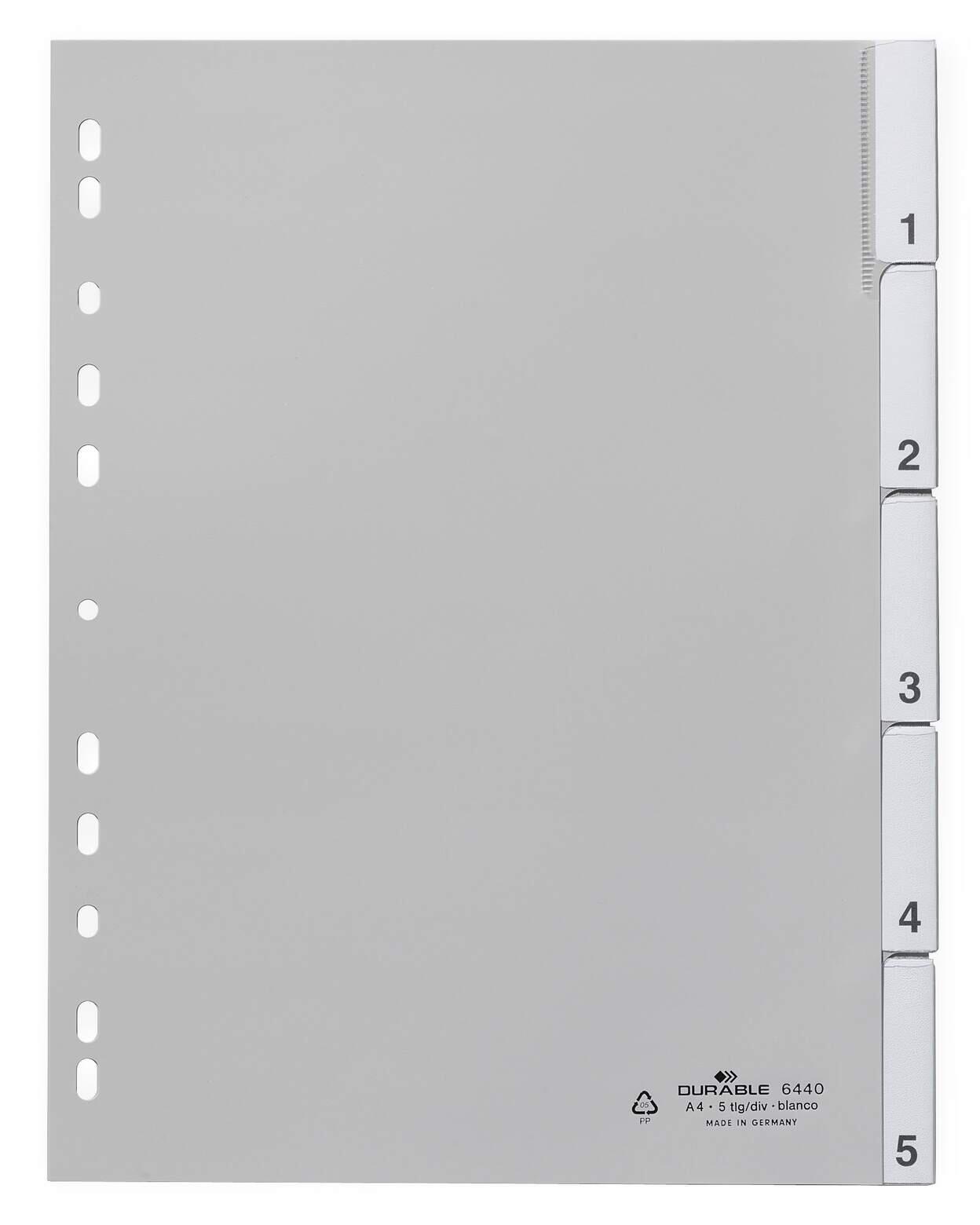 Das DURABLE Ordnerregister Vollformat 1-5 DIN A4 ist die perfekte Lösung für eine strukturierte und übersichtliche Ablage deiner Dokumente. Mit seinen umschweißten Taben und auswechselbaren Einsteckschildern bietet dieses Register nicht nur eine hohe Flexibilität, sondern auch eine ansprechende Optik. Die bereits bedruckten Einsteckschilder sowie die zusätzlichen blanko Einsteckschilder ermöglichen dir eine individuelle Beschriftung, sodass du deine Unterlagen nach deinen Wünschen organisieren kannst. Gefertigt aus hochwertigem Polypropylen, zeichnet sich das DURABLE Ordnerregister durch Langlebigkeit und Robustheit aus. Dies garantiert, dass deine Dokumente nicht nur sicher, sondern auch stilvoll aufbewahrt werden. Mit einer Größe von A4 (210 x 297 mm) und der mehrfachen Lochung ist das Register ideal für die Verwendung in gängigen Ordnern geeignet. Die graue Farbe des Registers sorgt für eine elegante und professionelle Präsentation deiner Unterlagen. Egal, ob im Büro, in der Schule oder zu Hause, das DURABLE Ordnerregister ist ein praktischer Begleiter, der dir hilft, den Überblick zu behalten. Mit fünf Trennelementen kannst du verschiedene Themen oder Projekte mühelos voneinander abgrenzen. Die Maße von 230 mm in der Breite und 297 mm in der Höhe sind optimal für die Ablage in jedem Standardordner. Mit diesem Ordnerregister bist du bestens ausgestattet, um deine Dokumente effizient zu organisieren und schnell wiederzufinden. Vertraue auf die Qualität von DURABLE und erlebe, wie einfach und angenehm die Dokumentenverwaltung sein kann.Technische Daten