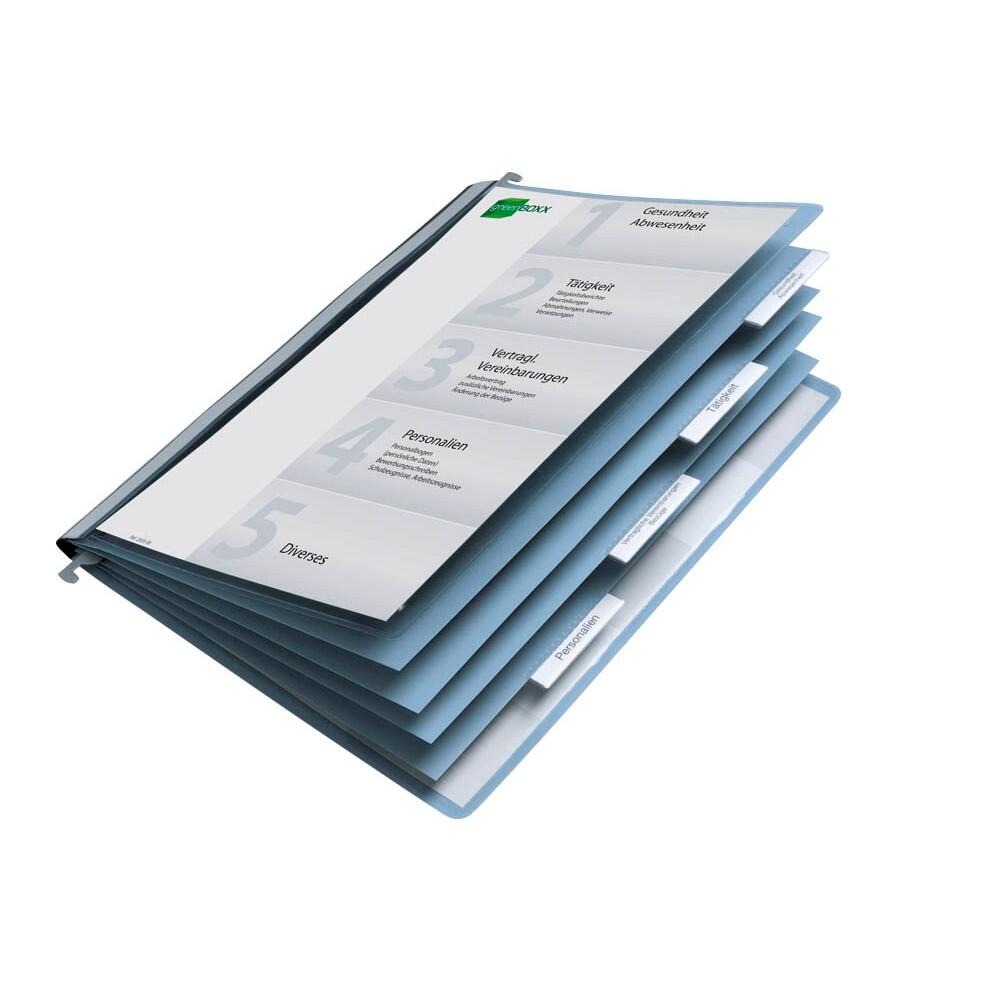 Der DURABLE Personalhefter aus hochwertigem Kunststoff in ansprechendem Blau bietet eine praktische Lösung für die Organisation deiner Unterlagen. Mit einer Breite von 34,5 cm und einer Höhe von 24,0 cm ist dieser Schnellhefter ideal für den täglichen Einsatz im Büro oder zu Hause. Das robuste Material aus Polyvinylchlorid (PVC) sorgt nicht nur für eine lange Lebensdauer, sondern schützt auch deine Dokumente vor Abnutzung und Beschädigungen. Mit fünf Abheftvorrichtungen, die eine kaufmännische Heftung ermöglichen, kannst du deine Unterlagen effizient sortieren und aufbewahren. Der Personalhefter ist mit einem Vollsichtreiter und Beschriftungsschildchen ausgestattet, sodass du jederzeit auf einen Blick erkennst, was sich im Hefter befindet. Dies erleichtert die Suche nach bestimmten Dokumenten und sorgt für eine übersichtliche Ablage. Zusätzlich bietet der DURABLE Personalhefter eine praktische Innentasche im hinteren Deckel sowie eine Tasche auf dem vorderen Deckel, die zusätzlichen Platz für lose Blätter oder Visitenkarten schafft. Die Flachleiste als Papierhalter sorgt dafür, dass deine Dokumente stets an ihrem Platz bleiben und nicht verrutschen. Die integrierten Tabulatoren ermöglichen eine einfache und schnelle Kennzeichnung der einzelnen Fächer, wodurch du deine Unterlagen noch schneller finden kannst. Seine vielseitigen Funktionen und das durchdachte Design machen den DURABLE Personalhefter zu einem unverzichtbaren Begleiter für alle, die Wert auf Ordnung und Übersichtlichkeit legen. Ob für den Einsatz im Büro, in der Schule oder für persönliche Projekte – dieser Schnellhefter überzeugt durch Funktionalität und ansprechende Optik.Technische Daten