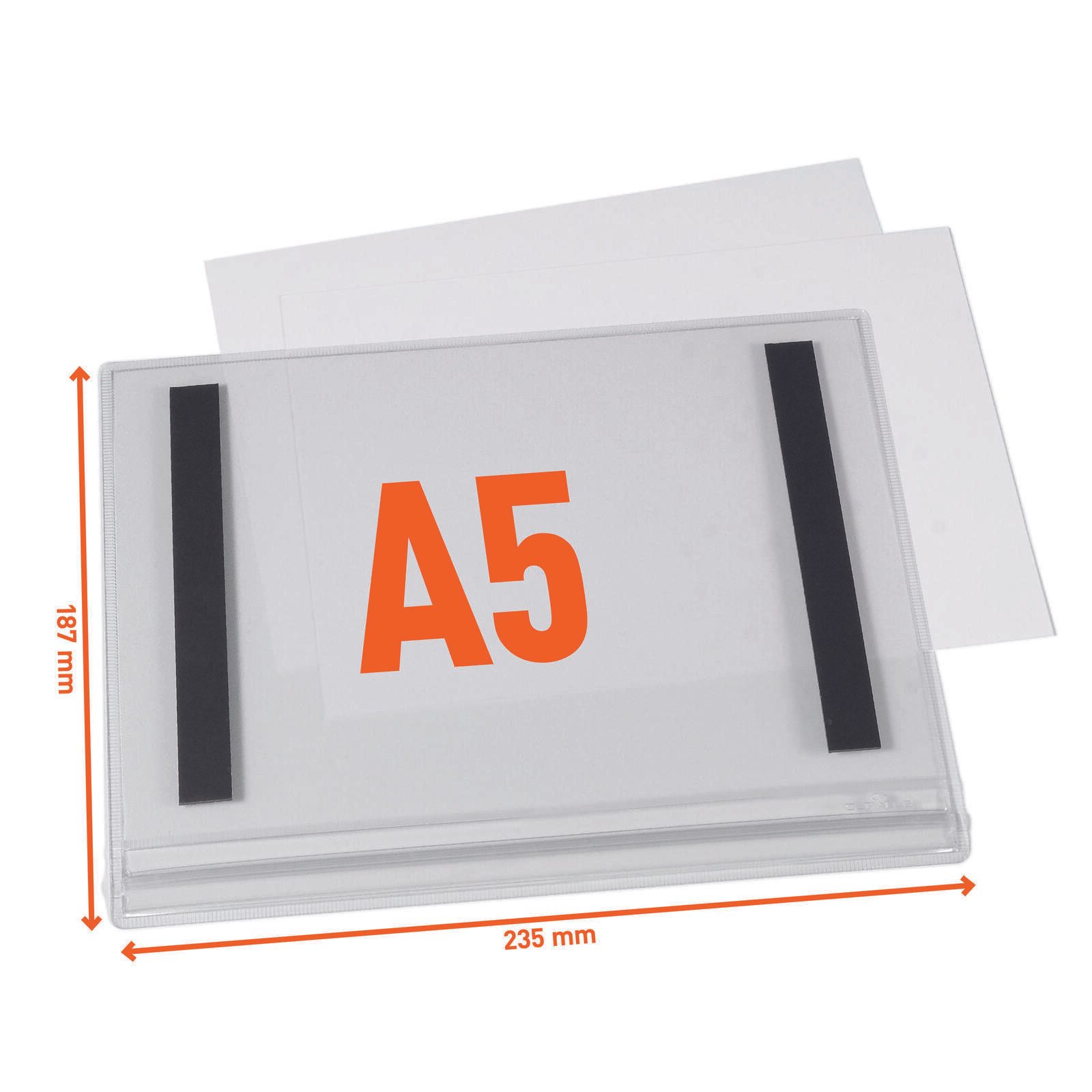 Die transparente Ausführung der Tasche ermöglicht eine klare Sicht auf die eingesteckten Inhalte, ohne dass diese durch störende Reflexionen beeinträchtigt werden. Mit einer schlanken Bautiefe von nur 0,6 mm und den Maßen 187,0 x 235,0 mm ist die Tasche ideal für A5-Formate geeignet und fügt sich unauffällig in jede Umgebung ein. Besonders praktisch ist die magnetische Rückseite, die eine einfache und flexible Anbringung an metallischen Oberflächen ermöglicht, ohne dass Werkzeug oder Klebematerialien benötigt werden.