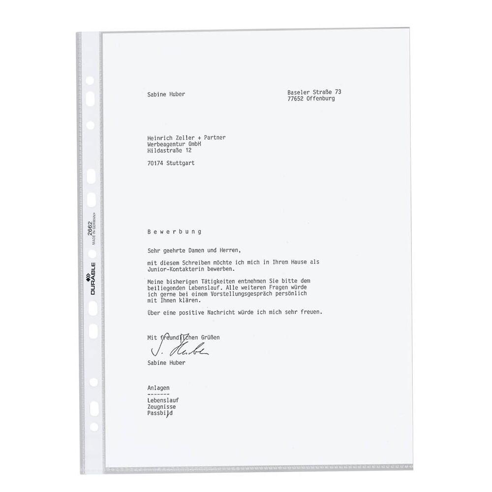 Die DURABLE PREMIUM Prospekthülle DIN A4 genarbt bietet dir eine hochwertige Lösung zur Aufbewahrung und Präsentation deiner Dokumente. Hergestellt aus robustem Polypropylen, zeichnen sich diese Prospekthüllen durch ihre Dokumentenechtheit aus, was bedeutet, dass deine wichtigen Unterlagen optimal geschützt sind und nicht durch Umwelteinflüsse wie Feuchtigkeit oder Schmutz beschädigt werden. Mit einer Materialstärke von 80 µm bieten diese Hüllen eine Premiumqualität, die sowohl Stabilität als auch Flexibilität gewährleistet. Du kannst sicher sein, dass deine Dokumente in diesen Hüllen nicht nur sicher, sondern auch stilvoll aufbewahrt werden. Die Lochrandverstärkung sorgt dafür, dass die Hüllen auch bei häufigem Gebrauch nicht reißen oder sich abnutzen. Dies macht sie ideal für den täglichen Einsatz im Büro oder für Präsentationen. Die universelle Lochung ermöglicht es dir, die Prospekthüllen mühelos in Ordnern und Ringbüchern abzuheften. So hast du jederzeit schnellen Zugriff auf deine Unterlagen, ohne sie aus der Hülle nehmen zu müssen. Das Format DIN A4 hoch und die offene Oberseite erleichtern das Einlegen und Entnehmen von Dokumenten, was dir eine effiziente Handhabung garantiert. Ob für wichtige Verträge, Präsentationen oder Schulungsunterlagen, die DURABLE PREMIUM Prospekthülle ist die perfekte Wahl, um deine Dokumente ordentlich und professionell zu präsentieren. Mit einer Packung von 100 Stück bist du bestens ausgestattet, um alle deine Unterlagen sicher und stilvoll zu organisieren.Technische Daten