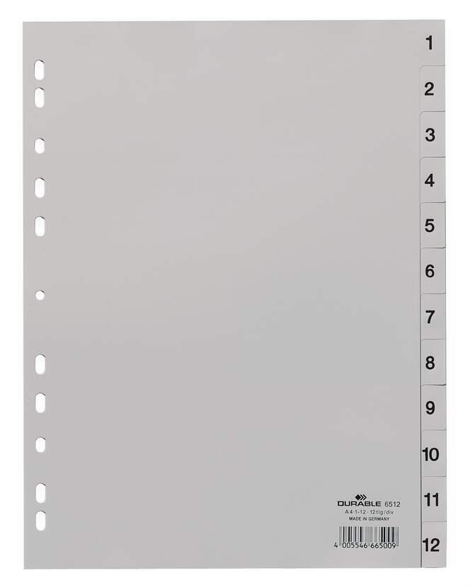 Das DURABLE Register A4 1-12 ist die ideale Lösung für eine übersichtliche und strukturierte Ablage deiner Dokumente. Mit seinen 12 geprägten Taben, die von 1 bis 12 nummeriert sind, ermöglicht es eine einfache und schnelle Unterteilung deiner Unterlagen. Die universelle Lochung sorgt dafür, dass das Register in alle gängigen Ordner passt, sodass du es flexibel und vielseitig nutzen kannst. Hergestellt aus hochwertigem Polypropylen (PP) bietet dieses Register nicht nur eine ansprechende graue Farbe, sondern auch eine hohe Langlebigkeit und Widerstandsfähigkeit. Die volldeckenden Trennblätter sind speziell für DIN A4 Formate (210 x 297 mm) konzipiert, wodurch du sicher sein kannst, dass deine Dokumente optimal geschützt und ordentlich präsentiert werden. Mit einer Breite von 230 mm und einer Höhe von 297 mm ist es perfekt dimensioniert für den Einsatz in Büros, Schulen oder zu Hause. Die 11 Lochungen ermöglichen eine einfache Handhabung und ein schnelles Einordnen in jeden Ordner. Ob du nun wichtige Berichte, Präsentationen oder andere Unterlagen organisieren möchtest, das DURABLE Register sorgt dafür, dass alles an seinem Platz bleibt und du jederzeit schnell darauf zugreifen kannst. Die praktische und funktionale Gestaltung macht das DURABLE Register A4 1-12 zu einem unverzichtbaren Hilfsmittel für jeden, der Wert auf Ordnung und Übersichtlichkeit legt. Vertraue auf die Qualität von DURABLE und erlebe, wie einfach das Organisieren deiner Dokumente sein kann.Technische Daten