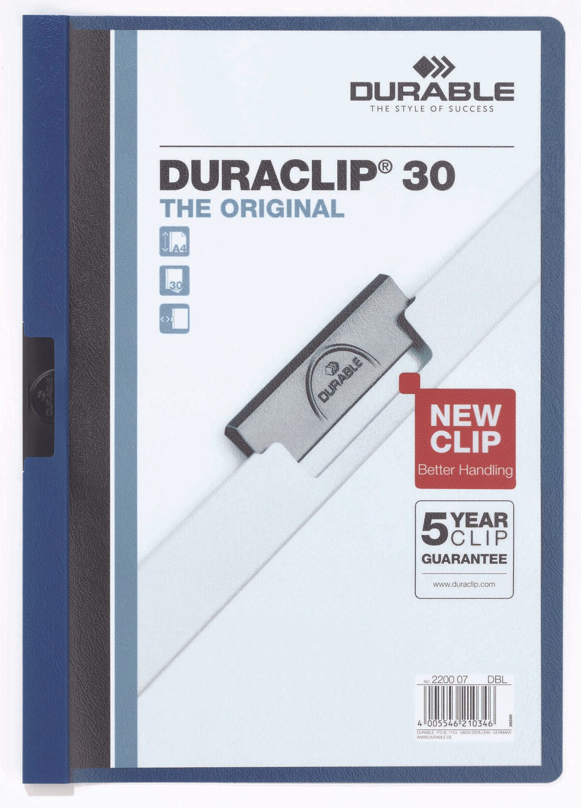 Der DURABLE Klemmhefter Duraclip im Format DIN A4 ist die ideale Lösung für die ordentliche Aufbewahrung und Präsentation deiner Dokumente. Mit seiner eleganten dunkelblauen Farbe und der transparenten Vorderseite bietet dieser Klemmhefter nicht nur Funktionalität, sondern auch eine ansprechende Optik. Hergestellt aus hochwertigem Kunststoff, vereint er Langlebigkeit und ansprechendes Design. Der Duraclip ist speziell für Formate bis DIN A4 konzipiert und bietet Platz für bis zu 30 Blatt. So kannst du sicherstellen, dass deine Unterlagen stets gut geschützt und organisiert sind. Die robuste Rückseite aus Kunststoff sorgt dafür, dass deine Dokumente nicht knicken oder beschädigt werden, während die schwarze Klemme aus Metall einen sicheren Halt garantiert. In einer praktischen Packung mit 25 Stück ist der DURABLE Klemmhefter Duraclip die perfekte Wahl für Büro, Schule oder Zuhause. Egal, ob du wichtige Unterlagen, Präsentationen oder persönliche Notizen aufbewahren möchtest, dieser Klemmhefter erfüllt all deine Anforderungen. Mit seinem funktionalen Design und der hochwertigen Verarbeitung ist er ein unverzichtbarer Begleiter im täglichen Leben. Vertraue auf die Qualität von DURABLE und erlebe, wie der Klemmhefter Duraclip deine Dokumentenorganisation revolutioniert.Technische Daten
