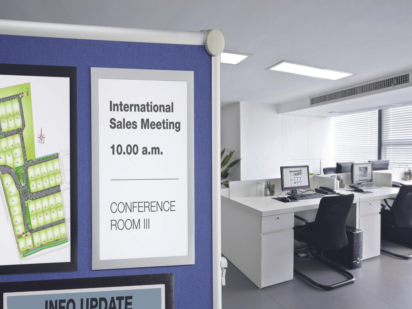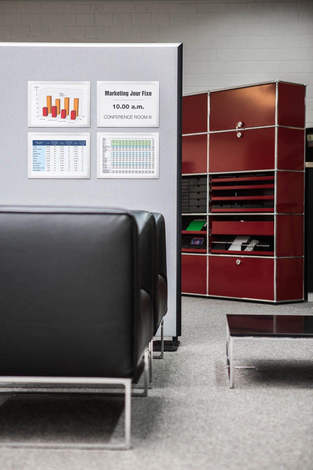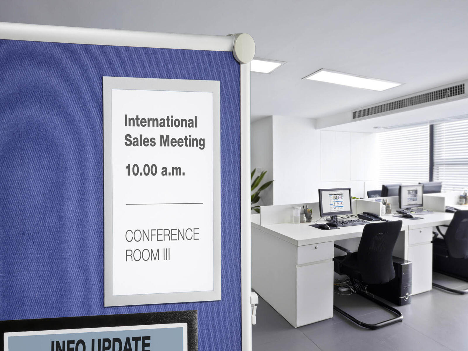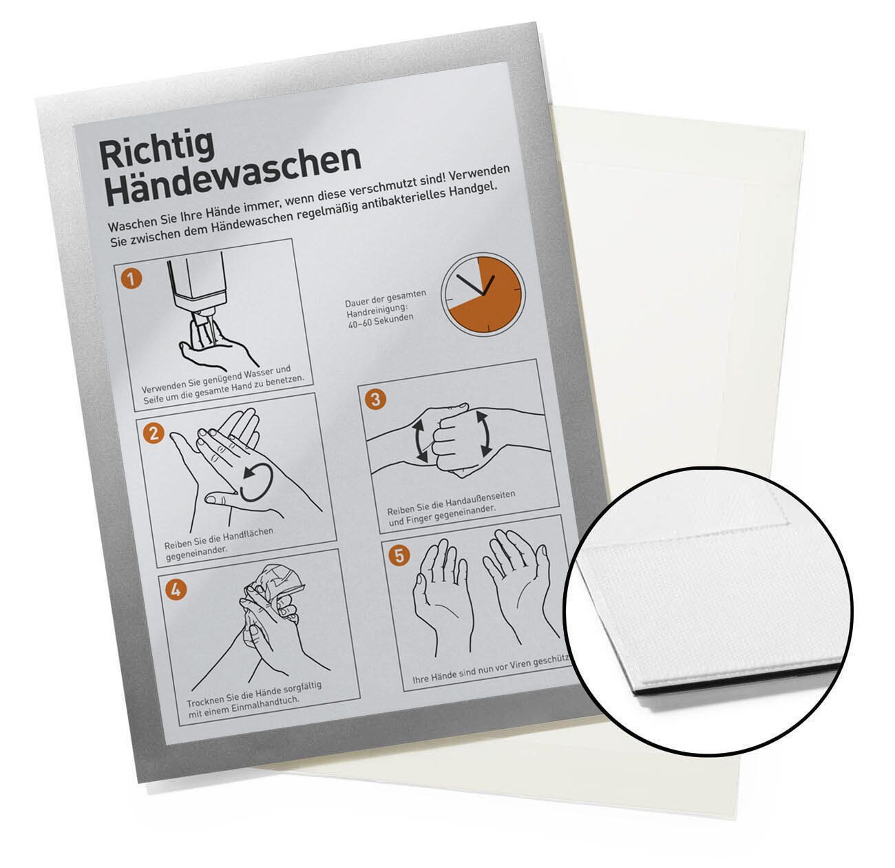 Der Magnetrahmen zeichnet sich durch seine einfache Handhabung aus - die Öffnung unten und seitlich ermöglicht ein schnelles Wechseln der Einlagen, ohne den Rahmen von der Wand abnehmen zu müssen. Die dezente Silberfarbe verleiht deiner Präsentation eine moderne Note.
