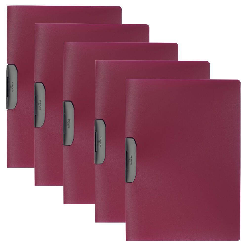 Der DURABLE Klemmhefter Duraswing im eleganten dunkelrot ist die ideale Lösung für die ordentliche Aufbewahrung und Präsentation deiner Dokumente im Format DIN A4. Mit einem großzügigen Füllvermögen von bis zu 30 Blatt bietet dieser Klemmhefter ausreichend Platz für deine wichtigen Unterlagen, sei es für die Schule, das Büro oder die Freizeit. Hergestellt aus hochwertigem Polypropylen (PP) überzeugt der Duraswing nicht nur durch seine ansprechende Optik, sondern auch durch seine Langlebigkeit und Robustheit. Das Material ist widerstandsfähig gegen Feuchtigkeit und sorgt dafür, dass deine Dokumente auch bei häufigem Gebrauch optimal geschützt sind. Die Vorderseite des Hefters in einem stilvollen Rot verleiht deinem Arbeitsplatz einen frischen Akzent, während die anthrazitfarbene Klemme für einen modernen Kontrast sorgt. Der Duraswing ist nicht nur funktional, sondern auch praktisch. Mit einem Pack von 5 Stück bist du bestens ausgestattet, um deine Unterlagen zu organisieren und zu kategorisieren. Die einfache Handhabung des Kunststoffclips ermöglicht ein schnelles Einlegen und Entnehmen von Dokumenten, sodass du jederzeit den Überblick behältst. Egal, ob du Präsentationen vorbereitest, Berichte abheftest oder kreative Projekte dokumentierst, der DURABLE Klemmhefter Duraswing ist dein zuverlässiger Begleiter. Durch seine vielseitige Einsetzbarkeit und das ansprechende Design ist dieser Klemmhefter die perfekte Wahl für alle, die Wert auf Ordnung und Stil legen. Vertraue auf die Qualität von DURABLE und genieße die Vorteile eines durchdachten Produkts, das dir im Alltag viele Vorteile bietet.Technische Daten