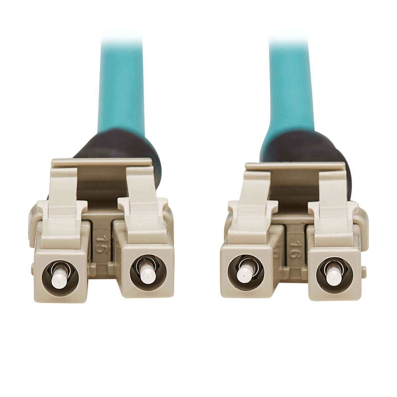 Dieses Glasfaserkabel verfügt über einen Aqua-PVC-Mantel mit LC-Duplex-Enden. Die Farbcodierung ermöglicht eine einfache und schnelle OM3-Erkennung in einem überfüllten Rack, Patch-Panel oder Arbeitsplatz und hilft, unbeabsichtigte Trennungen des Kabels zu verhindern.