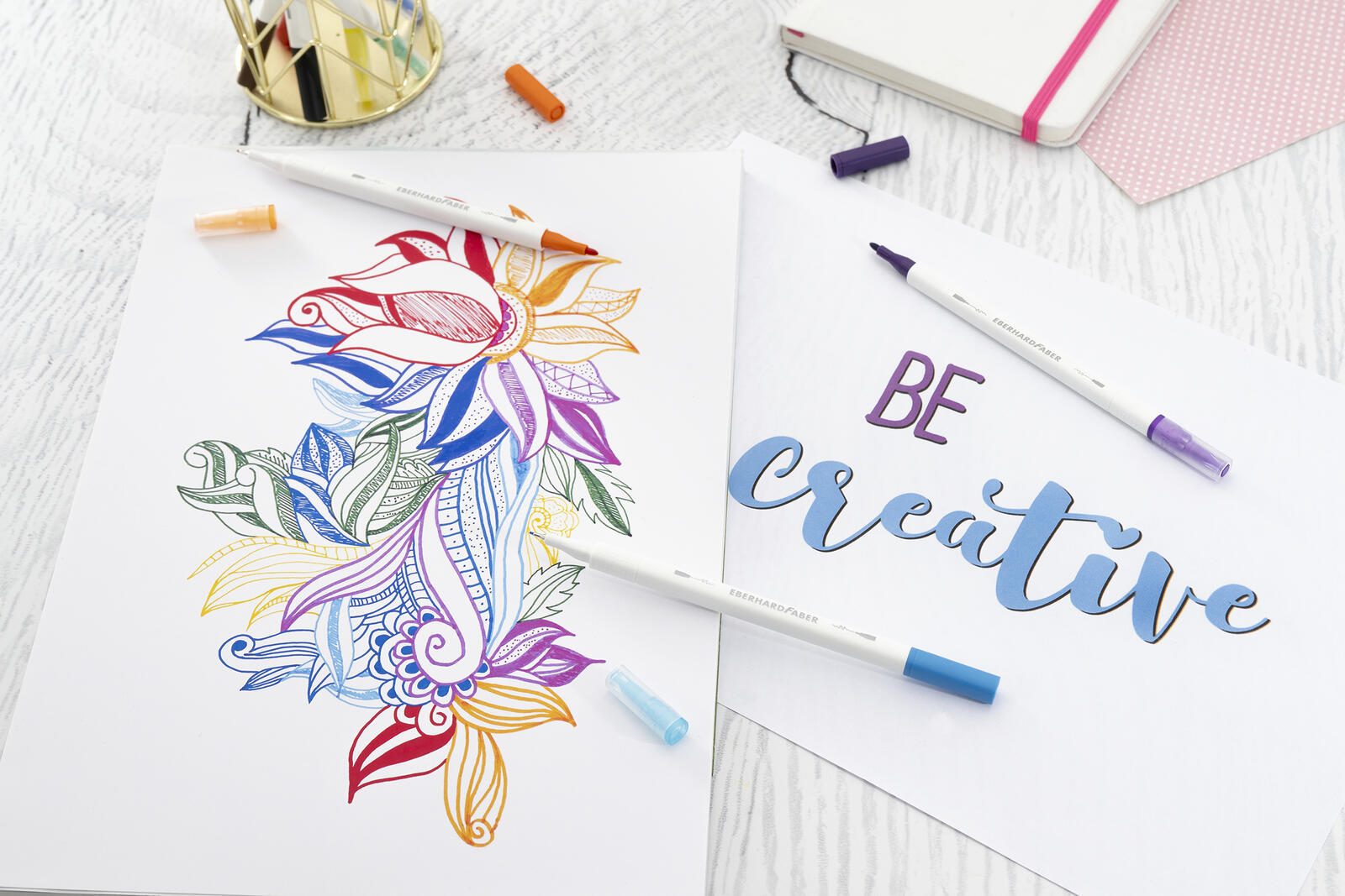 - Schreibfarbe: kadmiumgelb, kadmiumorange dunkel, geraniumrot hell, magenta, violett, türkis bläulich, helioblau rötlich, grasgrün, caput mortuum, schwarz