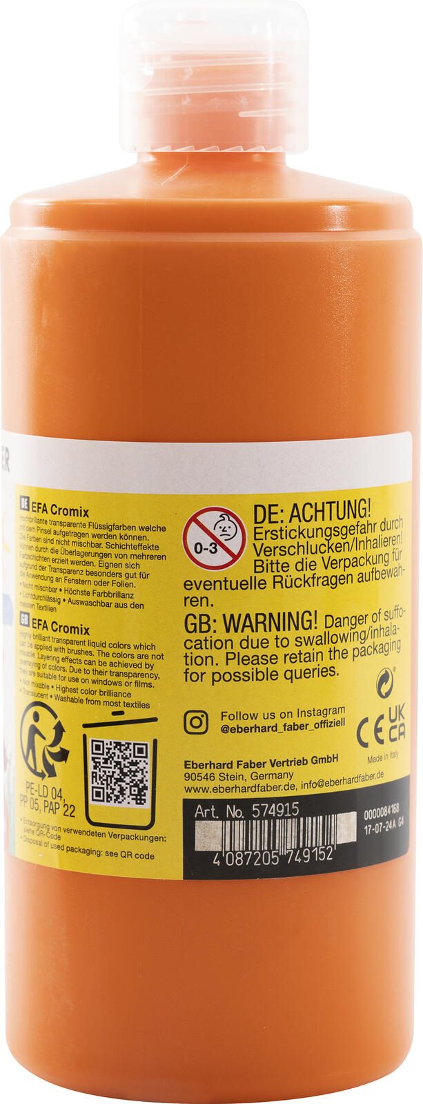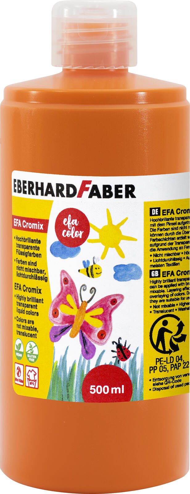 Die EBERHARD FABER EFA Cromix Transparentfarbe in der Farbe kadmiumorange wird in einer 500 ml Flasche geliefert. Diese Farbe gehört zur Produktkategorie der Fenstermalfarben und ist Teil der Bastelfarben-Familie. Sie eignet sich für verschiedene kreative Anwendungen, insbesondere zum Bemalen von Fenstern und anderen glatten Oberflächen.