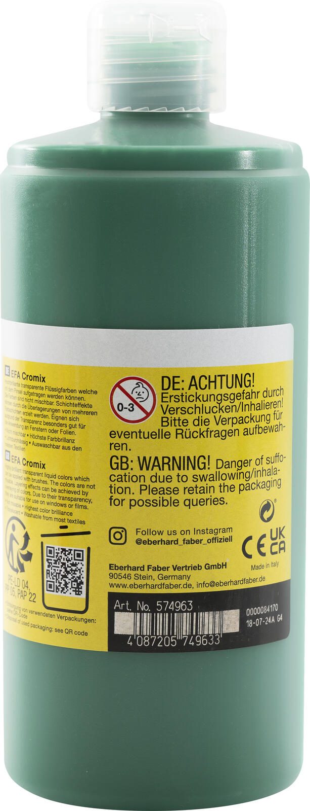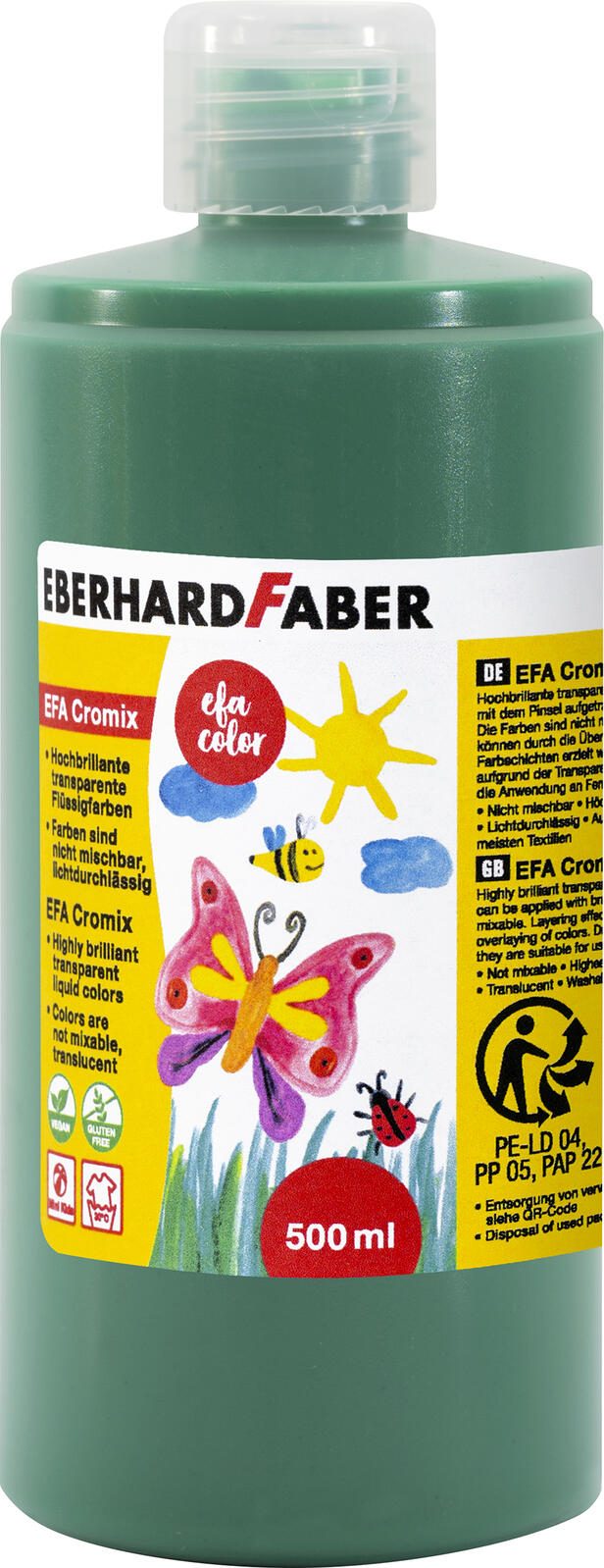 Die EBERHARD FABER EFA Cromix Transparentfarbe in der Farbe smaragdgrün wird in einer 500 ml Flasche geliefert. Diese Fenstermalfarbe eignet sich besonders für kreative Gestaltungen auf verschiedenen Untergründen. Die Farbe ist transparent und bietet dennoch eine sehr hohe Deckkraft, wodurch die Farbtöne intensiv und leuchtend erscheinen.