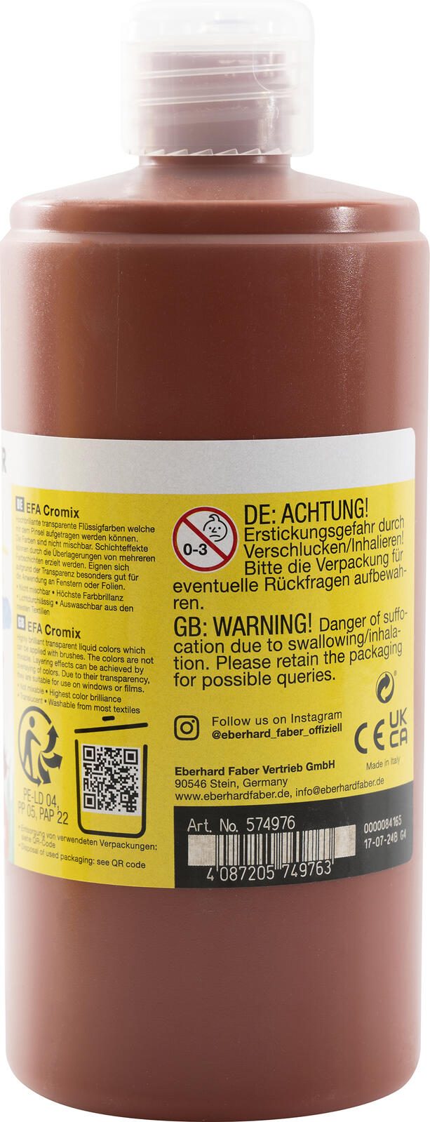Die EBERHARD FABER EFA Cromix Transparentfarbe in der Farbe van Dyck braun bietet eine Füllmenge von 500 ml und gehört zur Produktgruppe der Fenstermalfarben. Diese Farbe zeichnet sich durch ihre sehr hohe Deckkraft aus und haftet zuverlässig auf vielen verschiedenen Untergründen. Dadurch eignet sie sich besonders gut für kreative Malprojekte auf glatten Flächen wie Glas oder Fenstern.