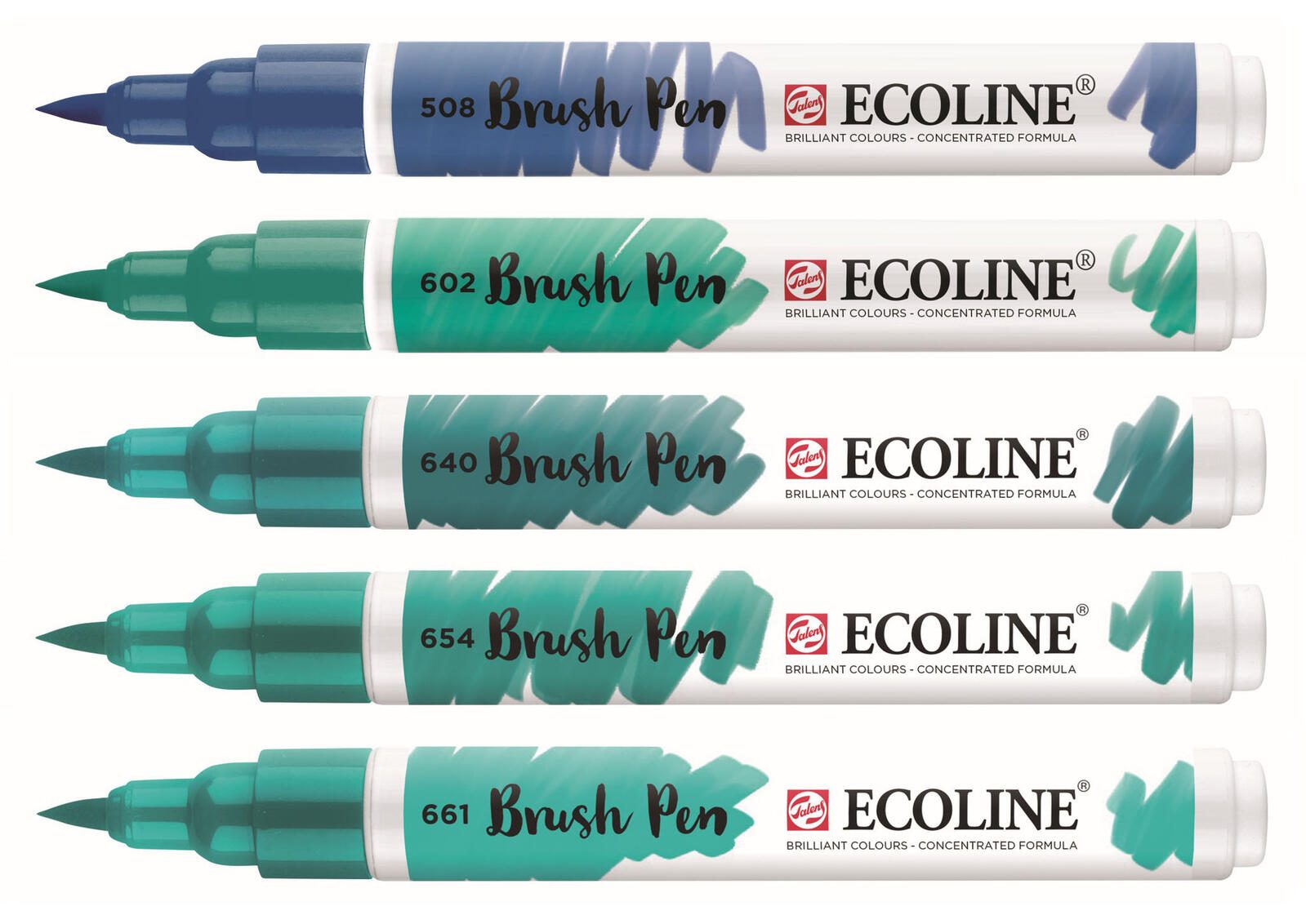 Die Talens ECOLINE® Brush-Pens in verschiedenen Grüntönen sind die perfekte Wahl für kreative Köpfe, die sowohl präzise Linien als auch ausdrucksstarke Pinselstriche lieben. Mit einer Strichstärke von 1.0 bis 3.0 mm bieten diese Pinselstifte eine außergewöhnliche Flexibilität, die es dir ermöglicht, sowohl feine Details als auch großzügige Farbflächen mühelos zu gestalten. Die Schreibfarben der Brush-Pens umfassen ein harmonisches Spektrum aus dunkelgrün, preußischblau, blaugrün, türkisgrün und tannengrün, die alle in einem praktischen Kunststoff-Etui geliefert werden. Diese Vielfalt an Farbtönen eröffnet dir unzählige Möglichkeiten, deine kreativen Ideen zum Leben zu erwecken. Egal, ob du Aquarell-Techniken verwendest oder einfach nur deine Zeichnungen und Skizzen aufpeppen möchtest, diese Pinselstifte sind dafür bestens geeignet. Die runde Spitze der Talens ECOLINE® Brush-Pens sorgt für ein angenehmes Schreibgefühl und ermöglicht es dir, die Strichbreite einfach zu variieren. So kannst du mit Leichtigkeit sowohl dünne, präzise Linien ziehen als auch ausdrucksstarke, breite Pinselstriche erstellen. Darüber hinaus sind sie ideal zum Ausfüllen größerer Farbflächen, was sie zu einem unverzichtbaren Werkzeug für jeden Künstler macht. Mit einer Packung, die fünf Stifte enthält, hast du stets die richtigen Farben zur Hand, um deine Projekte zu realisieren. Die hohe Qualität der Talens ECOLINE® Brush-Pens garantiert eine gleichmäßige Farbabgabe und eine hervorragende Deckkraft, sodass du deine Kunstwerke mit Leichtigkeit perfektionieren kannst. Lass deiner Kreativität freien Lauf und entdecke die vielseitigen Einsatzmöglichkeiten dieser hochwertigen Brush-Pens.Technische Daten
