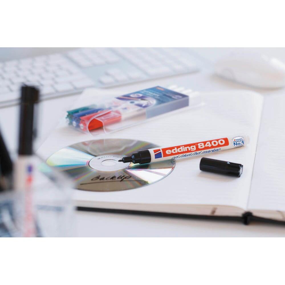 Der edding 8400 CD-Marker ist die ideale Lösung für die schonende und dauerhafte Beschriftung deiner CDs, DVDs und Blu-rays. Mit einer Strichstärke von 0,5 bis 1,0 mm ermöglicht dieser Marker präzise und klare Beschriftungen, die nicht nur funktional, sondern auch ästhetisch ansprechend sind. Die spezielle Tinte auf Wasserbasis sorgt dafür, dass die Farben lebendig und intensiv bleiben, während die wasserfesten, permanenten und wischfesten Eigenschaften eine langfristige Haltbarkeit garantieren. In der praktischen Packung sind vier verschiedene Farben enthalten: schwarz, blau, rot und grün. Diese Vielfalt ermöglicht es dir, deine Medien nach Kategorien oder Inhalten zu kennzeichnen, sodass du jederzeit schnell findest, was du suchst. Die besonders weiche Spitze des Markers sorgt für ein angenehmes Schreibgefühl und ermöglicht eine gleichmäßige Tintenabgabe, die ein sauberes und präzises Ergebnis liefert. Dank der belüfteten Sicherheitskappe und des integrierten Clips ist der edding 8400 CD-Marker nicht nur sicher im Gebrauch, sondern auch praktisch für unterwegs. Die kompakte Größe mit einem Durchmesser von 12 mm und einer Länge von 145 mm macht ihn zum perfekten Begleiter für deine Schreibbedürfnisse. Vertraue auf die Qualität von edding, einem renommierten Hersteller, der für seine langlebigen und zuverlässigen Schreibgeräte bekannt ist. Mit dem edding 8400 CD-Marker bist du bestens ausgestattet, um deine Medien professionell und individuell zu beschriften.Technische Daten