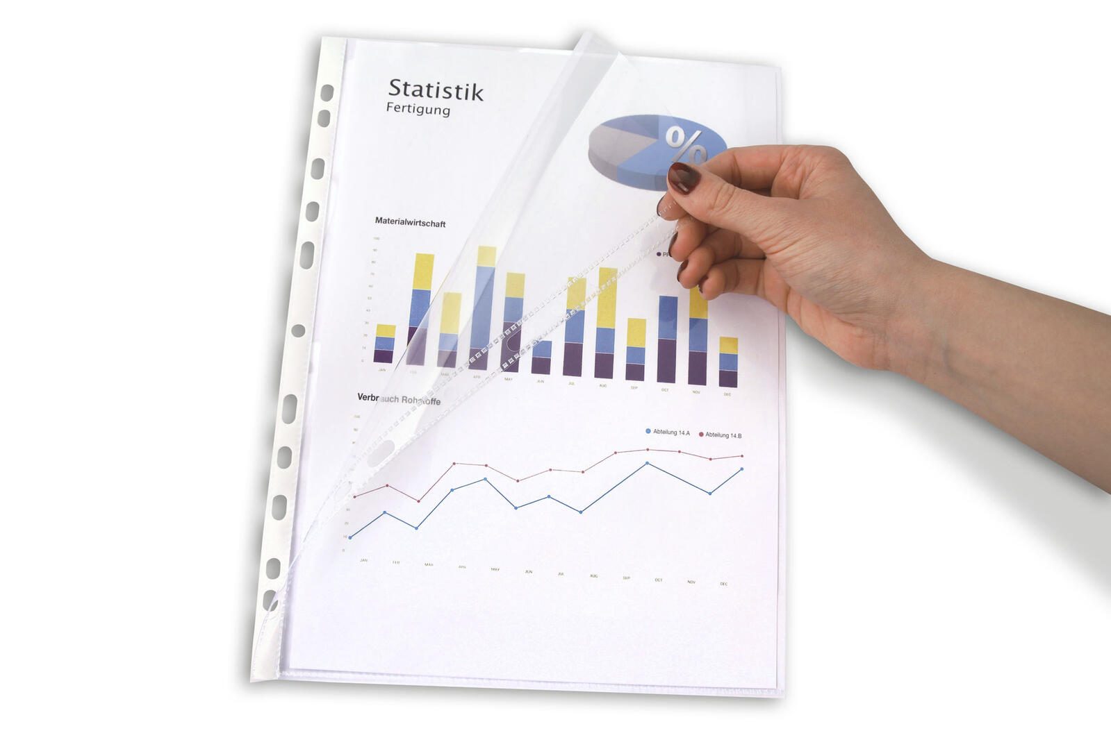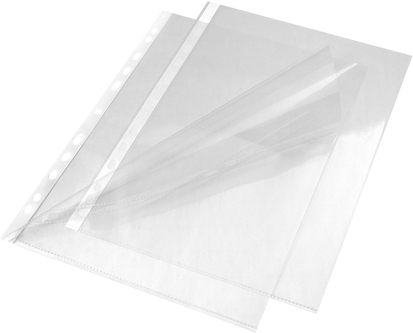 Die EICHNER Prospekthüllen in DIN A4 sind die perfekte Lösung für die sichere und übersichtliche Aufbewahrung deiner Dokumente. Mit einer Materialstärke von 0.12 mm bieten diese glasklaren Hüllen nicht nur einen optimalen Schutz, sondern auch eine ansprechende Präsentation deiner Unterlagen. Hergestellt aus hochwertigem Polypropylen (PP) sind die Hüllen dokumentenecht und frei von Aufdrucken, was sie ideal für professionelle Anwendungen macht. Die Vorderseite der Prospekthüllen ist mit Verstärkungsstreifen versehen, die für zusätzliche Stabilität sorgen und ein einfaches Abheften ermöglichen. Die Öffnung befindet sich sowohl oben als auch am Lochrand, was den Zugriff auf deine Dokumente erleichtert. Dank der Universal-Lochung kannst du die Hüllen problemlos in gängige Ordner einfügen, ohne dass du dich um die Kompatibilität kümmern musst. Mit einem Pack von 100 Stück bist du bestens ausgestattet, um deine Unterlagen ordentlich und geschützt zu verwahren. Die glatte Oberfläche der Hüllen sorgt für eine klare Sicht auf den Inhalt, sodass du jederzeit schnell die benötigten Informationen finden kannst. Egal, ob für Büro, Schule oder Zuhause, die EICHNER Prospekthüllen sind eine praktische und zuverlässige Wahl für jeden, der Wert auf Ordnung und Übersichtlichkeit legt. Vertraue auf die Qualität von EICHNER und entscheide dich für diese vielseitigen Prospekthüllen, die sowohl funktional als auch ästhetisch überzeugen.Technische Daten