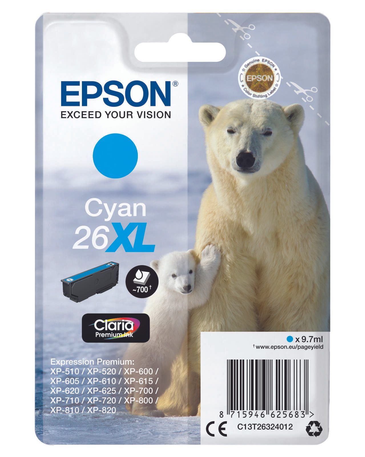 Epson Original 26XL Eisbär Druckerpatrone cyan 700 Seiten 9,7ml (C13T26324012)