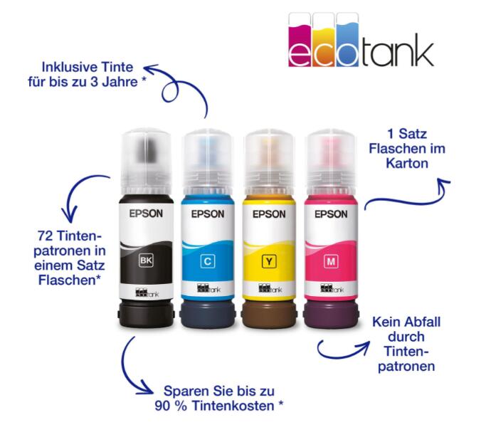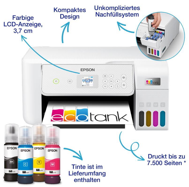 Dieser DIN-A4-Tintenstrahldrucker mit bedienungsfreundlichem LCD-Bildschirm eignet sich perfekt für moderne, vielbeschäftigte Haushalte. Er verfügt über nachfüllbare Tintentanks, wobei ein Flaschensatz dem Inhalt von bis zu 72 Tintenpatronen entspricht ‒ für extrem niedrige Druckkosten pro Seite. Zu den weiteren Vorteilen gehören mobiles Drucken, Wi-Fi, Kopieren und Scannen. Sparen Sie bis zu 90 % an Druckkosten mit den patronenfreien EcoTank Druckern von Epson. Dank der im Lieferumfang enthaltenen Tintenflaschen können die integrierten großvolumigen Tintentanks leicht nachgefüllt werden. Da keine Patronen ersetzt werden müssen und der Drucker flexible Konnektivitätsfunktionen und ein LC-Display bietet, ist er perfekt für alle geeignet, die hochwertige Ausdrucke zu unglaublich niedrigen Kosten pro Seite benötigen.
