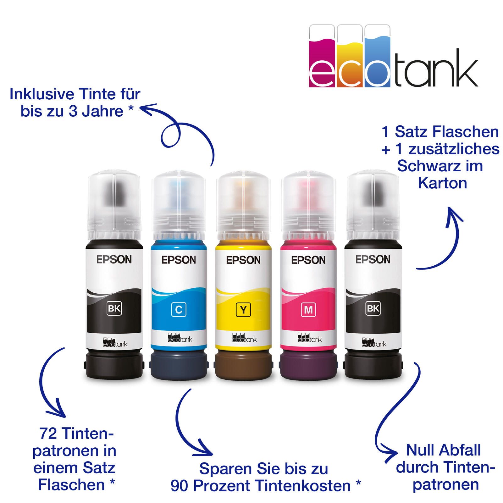 Mit diesem sparsamen Drucker reduzieren Sie Ihre Tintenkosten um bis zu 90 %. Im Lieferumfang enthalten ist ein Tintenvorrat für bis zu 3 Jahren. Ein Tintenflaschensatz reicht für bis zu 4.300 Seiten in Schwarzweiß und 7.300 Seiten in Farbe. Das entspricht der beeindruckenden Zahl von 72 Tintenpatronen!