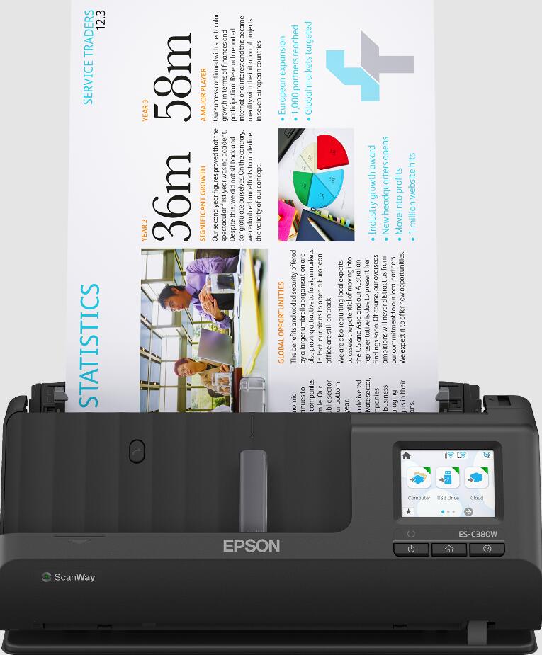 Leiten Sie gescannte Dokumente mit dem Farb-Touchscreen direkt an das richtige Ziel weiter, ohne eine Verbindung zu einem Computer herzustellen. Scannen Sie direkt in Netzwerkordner, E-Mails, USB-Speichersticks und bekannte Cloud-basierte Services wie Google Drive, Dropbox, Evernote und OneDrive for Business. Scannen Sie in Microsoft- Anwendungen Word, Excel, PowerPoint. Kompatibel mit Windows, Mac, Chromebook, Android Mopria, Apple AirPrint und der SmartPanel-Anwendung von Epson.