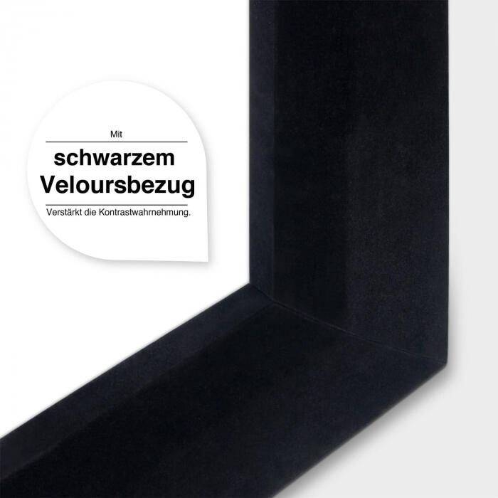 - schwarzer Rahmen mit Velours-Bespannung erhöht den Kontrast und entlastet das Auge