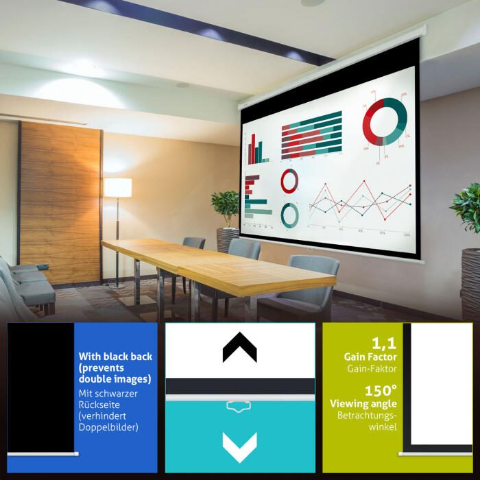 Angebracht werden kann diese Leinwand an der Decke oder an der Wand. Mithilfe des detaillierten mehrsprachigen Handbuchs ist die Montage einfach und schnell durchgeführt. Die Rollo-Leinwand lässt sich in regelmäßigen Abständen arretieren. Nach der Verwendung kann die Leinwand problemlos in das schlanke und platzsparende SlimFit-Gehäuse eingefahren werden.