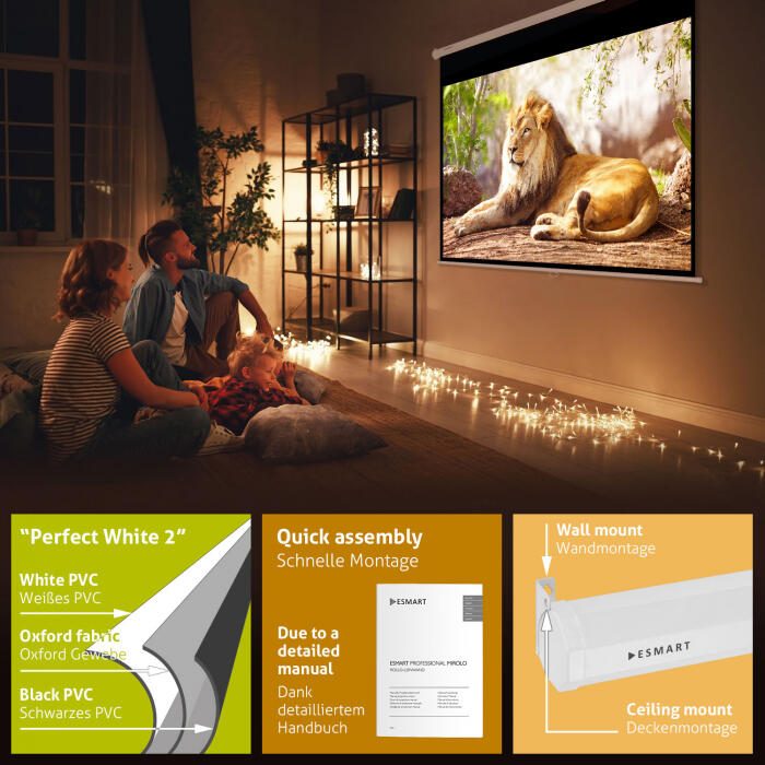 Das elegante Slimline-Oktagon-Gehäuse und das ESMART PerfectWhite 2 Leinwandtuch machen dieses Produkt zur idealen Leinwand für Heimkino, Präsentation, Schule und Business.