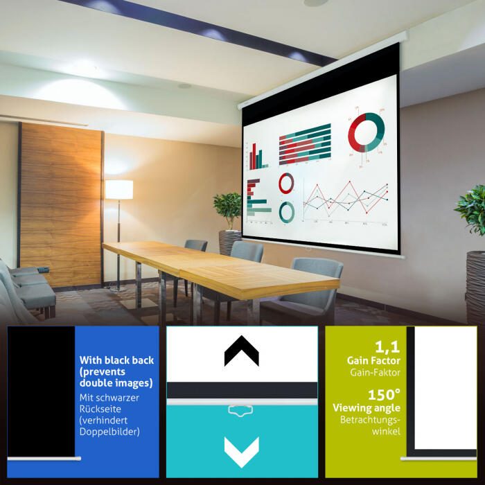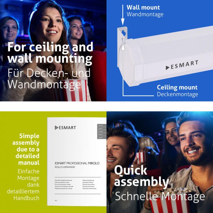 Angebracht werden kann diese Leinwand an der Decke oder an der Wand. Mithilfe des detaillierten mehrsprachigen Handbuchs ist die Montage einfach und schnell durchgeführt. Die Rollo-Leinwand lässt sich in regelmäßigen Abständen arretieren. Nach der Verwendung kann die Leinwand problemlos in das schlanke und platzsparende SlimFit-Gehäuse eingefahren werden.