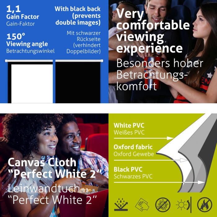 Für ein brillantes und kontrastreiches Bild sorgt der dreilagige diffus-mattweiße Leinwandstoff ESMART PerfectWhite 2. Verstärkt wird die Kontrastwahrnehmung noch durch den vollständig umlaufenden schwarzen Rand. Die schwarze Leinwandrückseite verhindert sogenannte Doppelbilder. Durch die Optimierung der Leinwandoberfläche für LED-, LCD- und DLP-Projektoren eignet sich diese Leinwand für alle privaten und geschäftlichen Anwendungen. Der hohe Betrachtungswinkel wird erreicht, indem das eintreffende Licht gleichmäßig in alle Richtungen verteilt wird. Die Projektion erscheint immer gleichmäßig ausgeleuchtet, kontrastreich und farbintensiv ohne hellere oder dunklere Stellen.