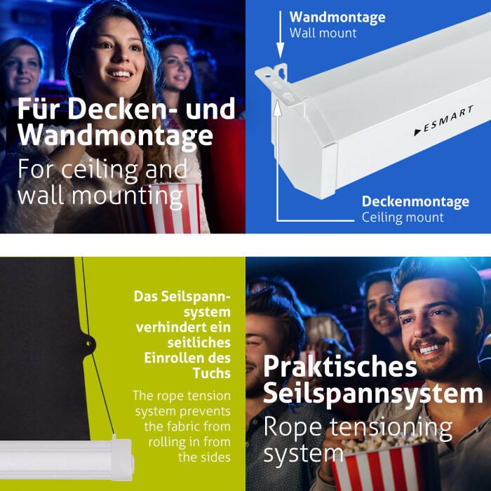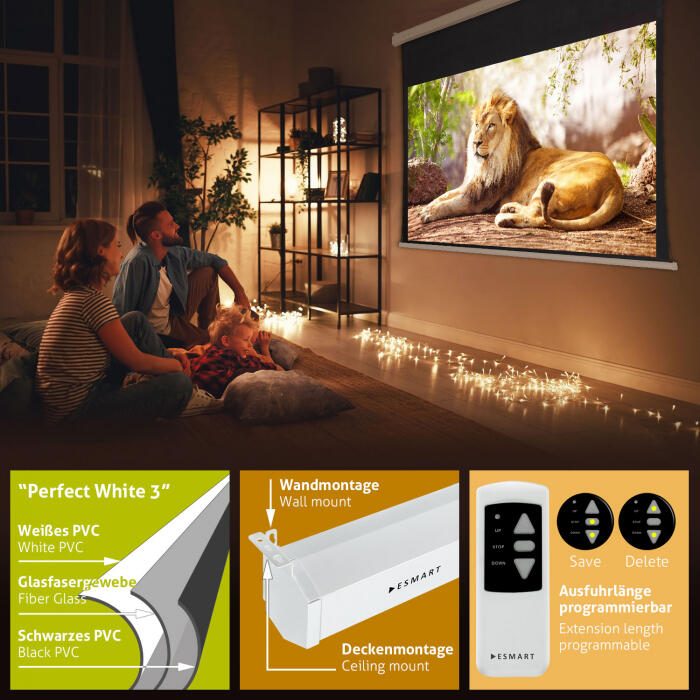 - dreilagiger, diffus-mattweiße Leinwandstoff für brilliantes und kontrastreiches Bild