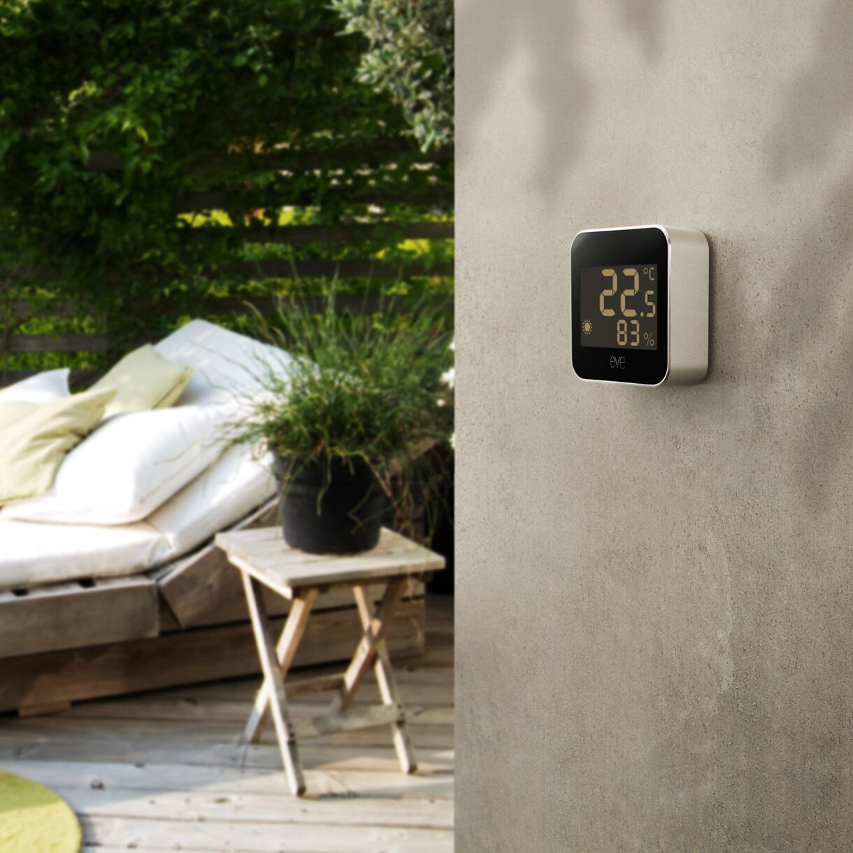 Von der Terrassenwand oder dem Gartentisch bis hin zum Pavillon oder der Gartenlaube – Eve Weather ist dank IPX4-Wasserbeständigkeit und elegantem Gehäuse an jedem Ort einsetzbar und hilfreich.