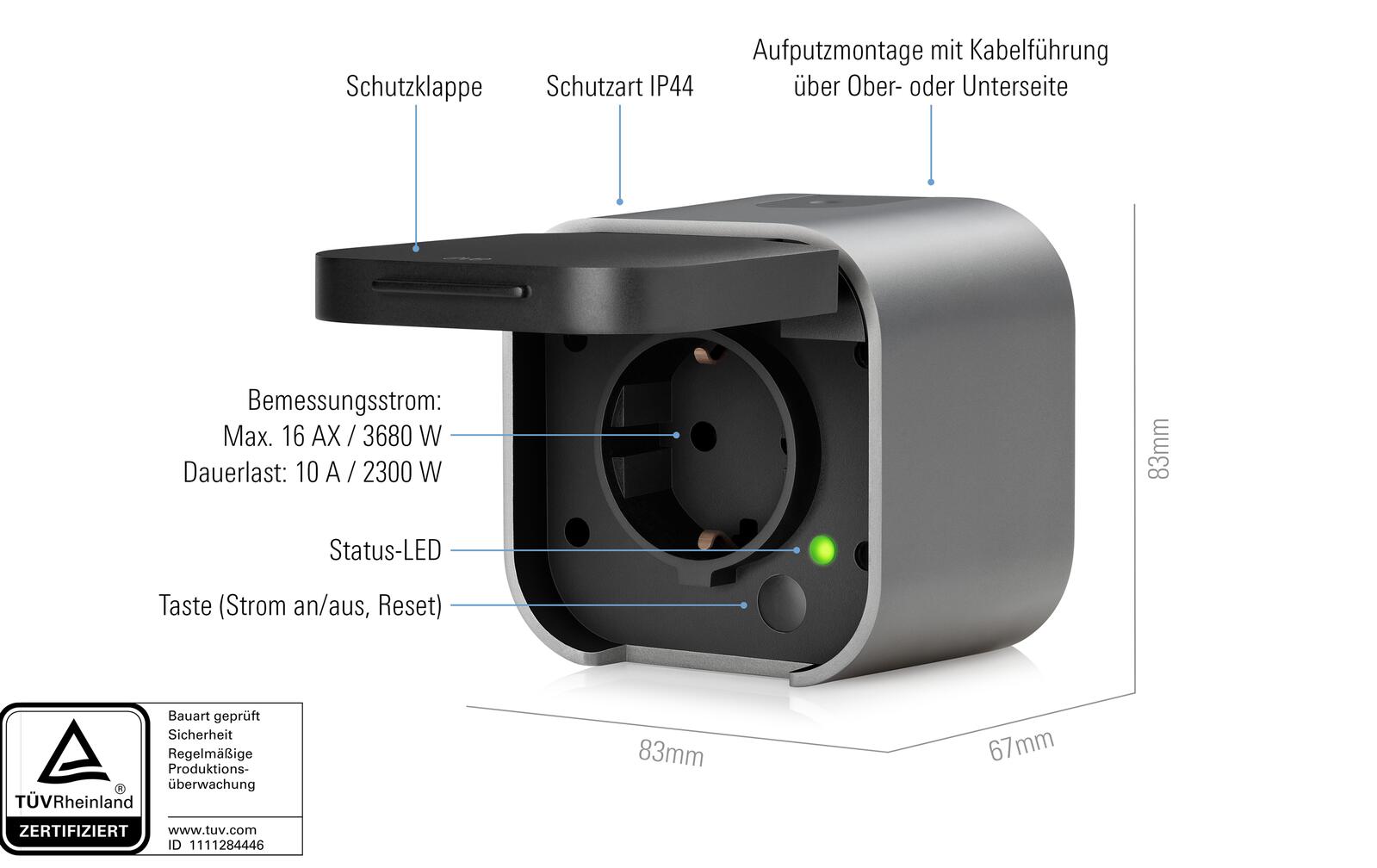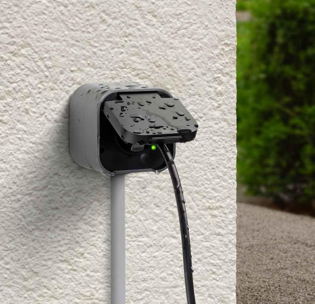 Eve Energy Outdoor ist TÜV-zertifiziert, ersetzt ganz einfach deine existierende Außensteckdose und lässt sich mühelos montieren. Das durchdachte Design ermöglicht die Kabelführung sowohl über die Ober- als auch die Unterseite von Eve Energy Outdoor.