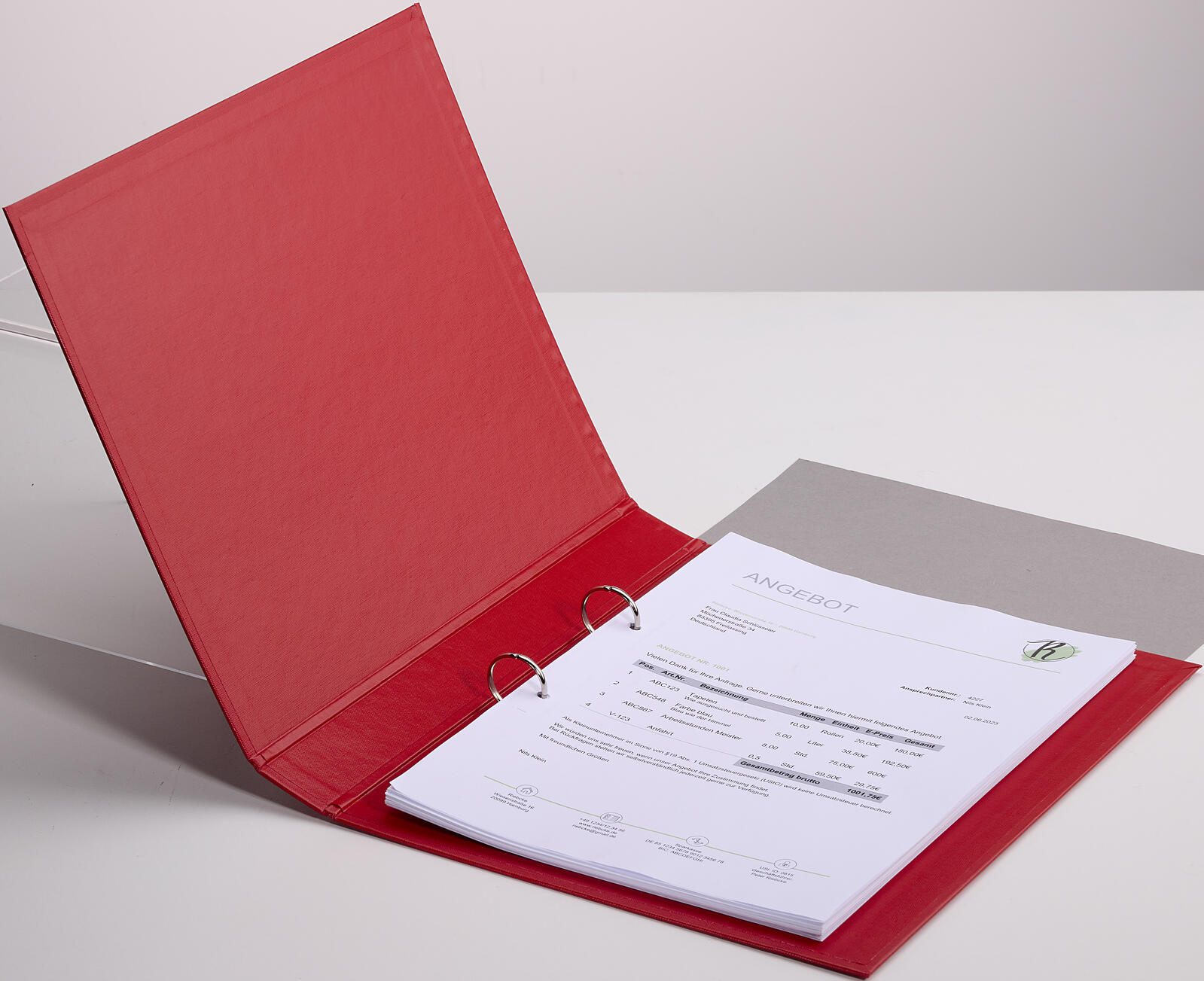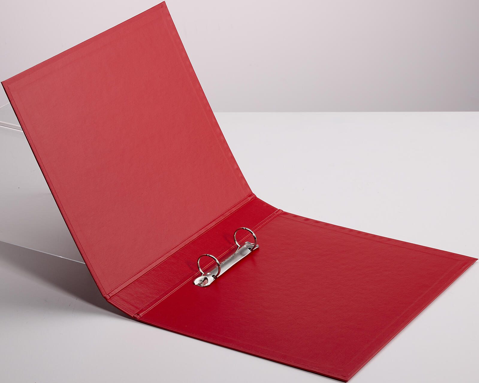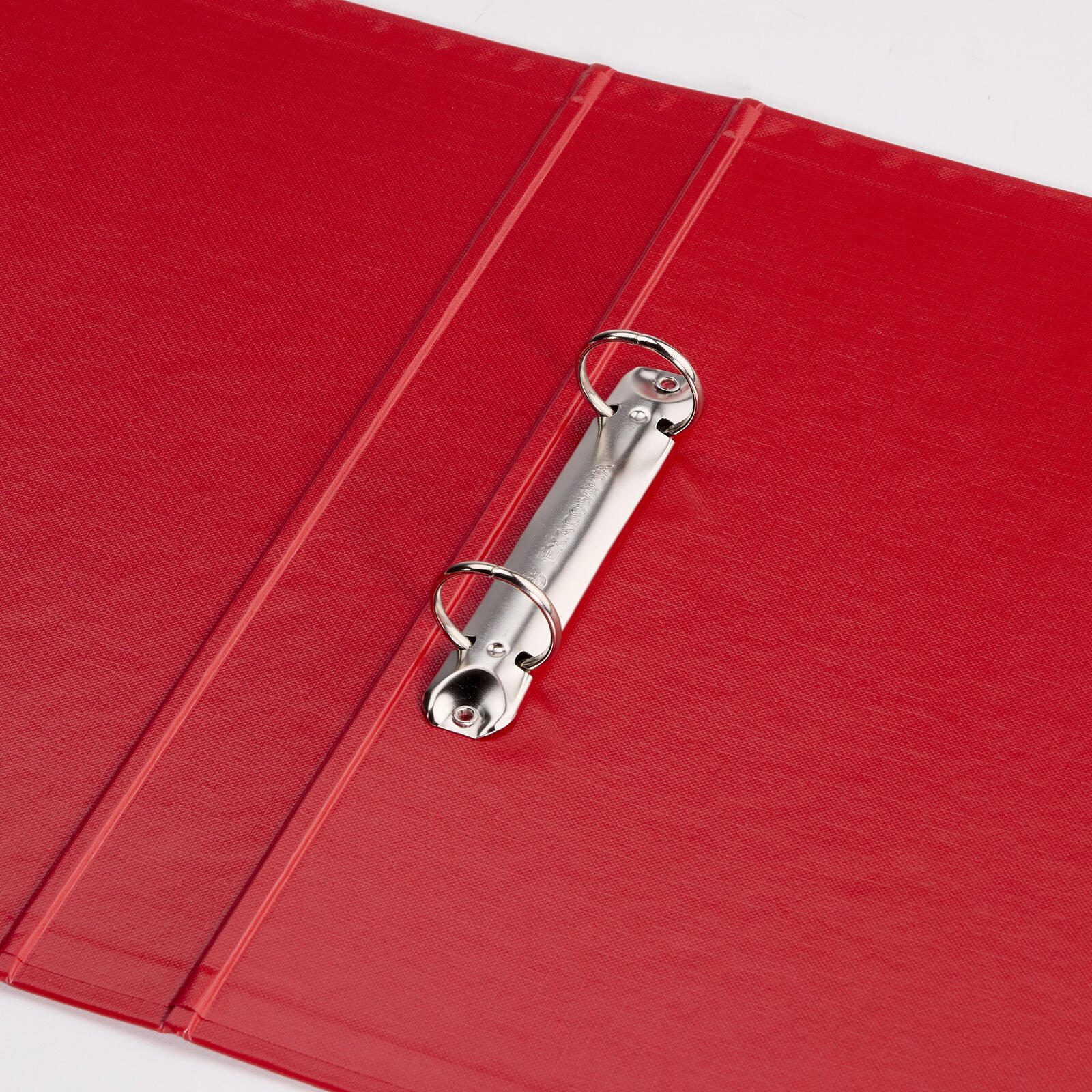 Das Ringbuch ist in einem roten Farbton gehalten und besteht aus Karton, der mit einer Kunststofffolie überzogen ist. Dieses Material sorgt für eine stabile und widerstandsfähige Oberfläche, die sowohl innen als auch außen verwendet wird. Das Ringbuch verfügt über keinen Niederhalter, keinen Kantenschutz und keine Überbreite. Zudem ist kein Einlegeformat für den Titel, die Rückseite oder den Rücken vorgesehen.