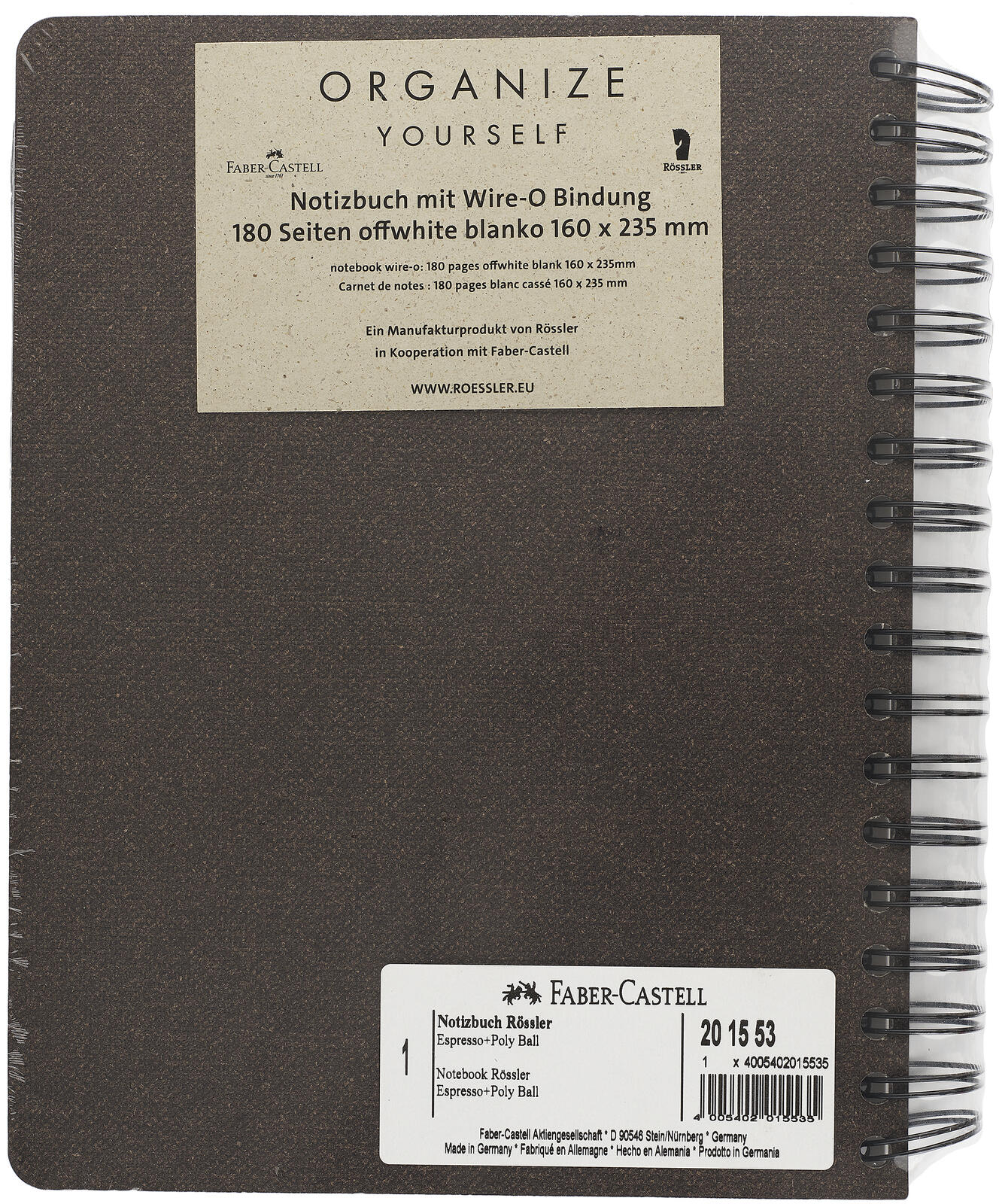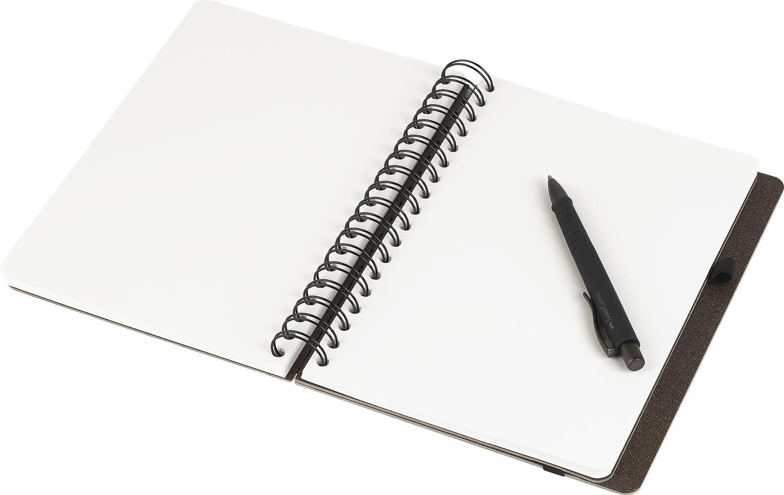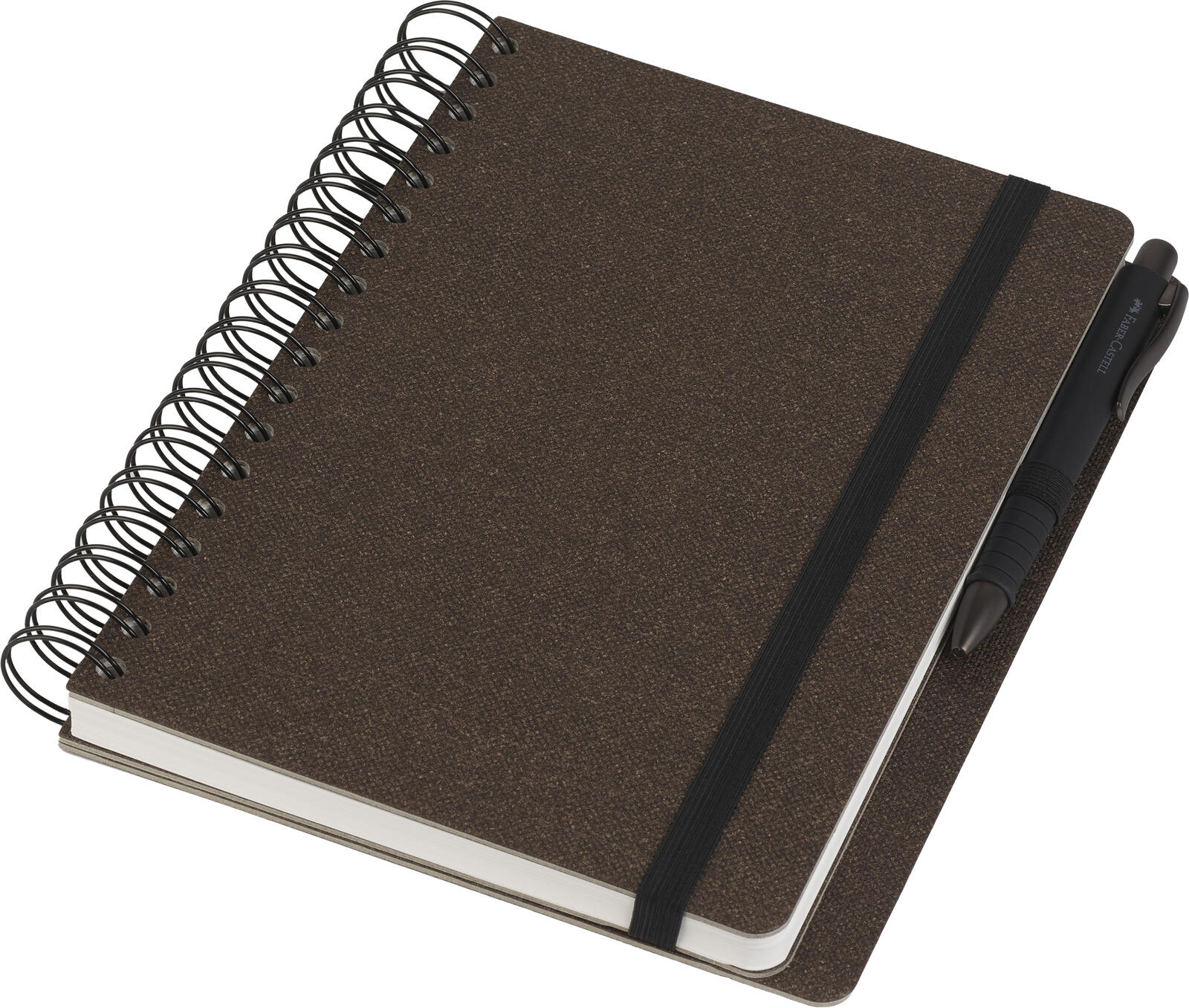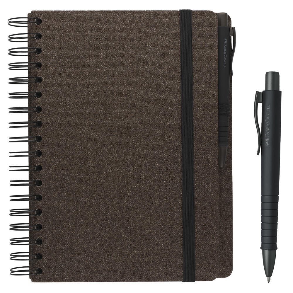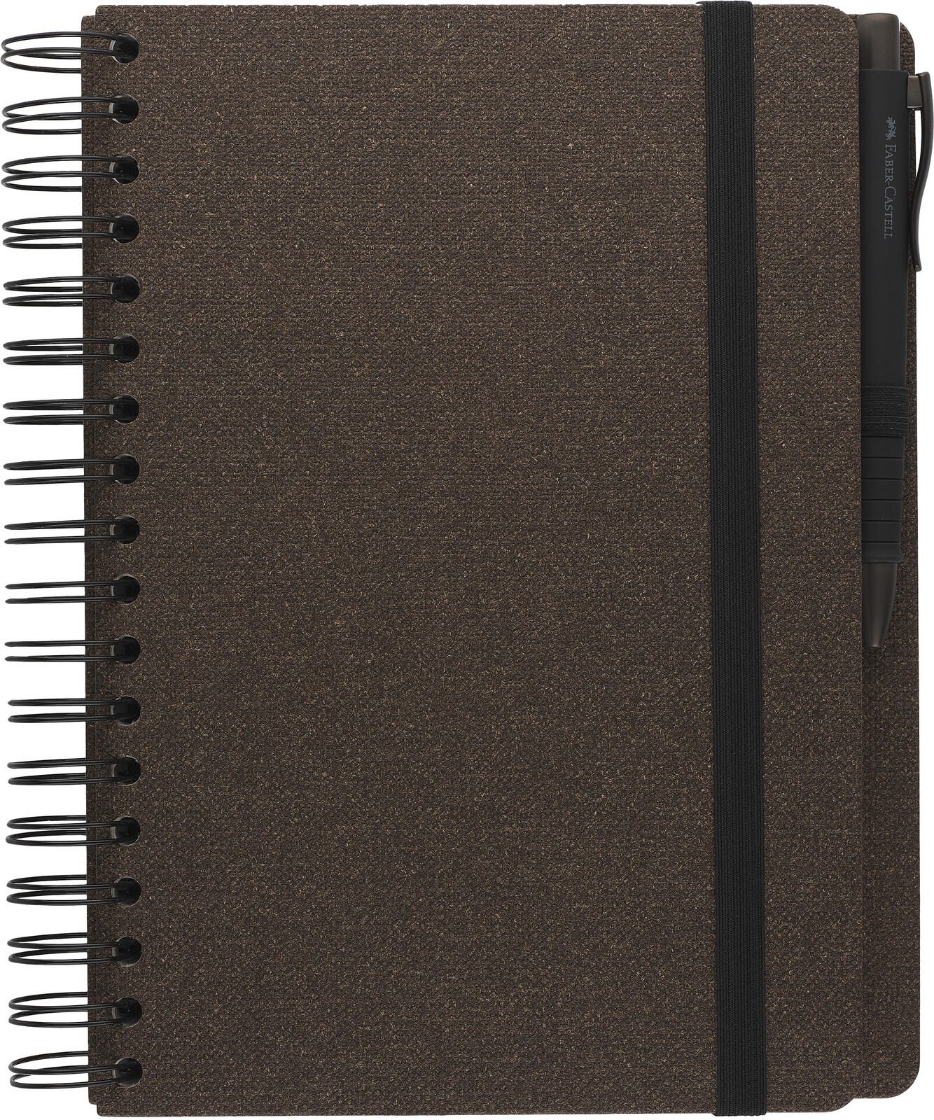 Der Einband des Notizbuchs ist in einem eleganten Espressoton gehalten und besteht aus robustem Karton, der das Buch stabil und langlebig macht. Die Bindung erfolgt über eine doppelte Spiralbindung, die das Umblättern der Seiten erleichtert und das Notizbuch flach aufschlagen lässt. Einen Verschluss besitzt das Buch nicht, was einen schnellen Zugriff auf die Seiten ermöglicht.