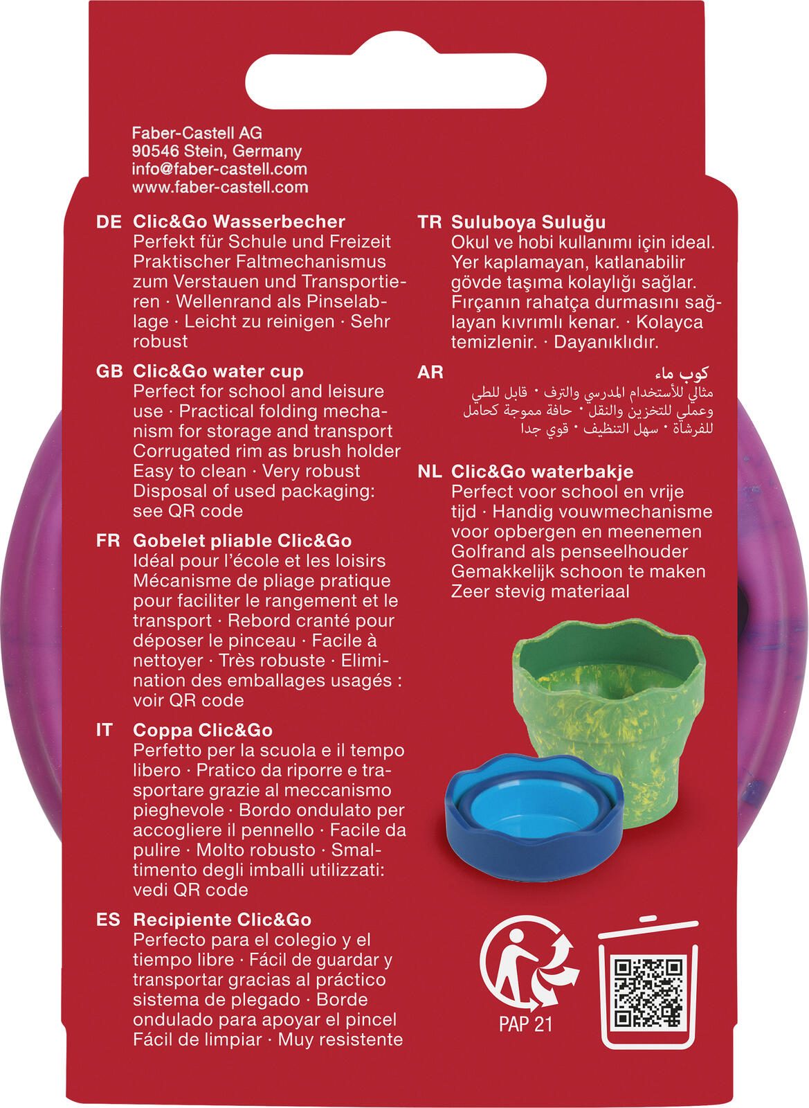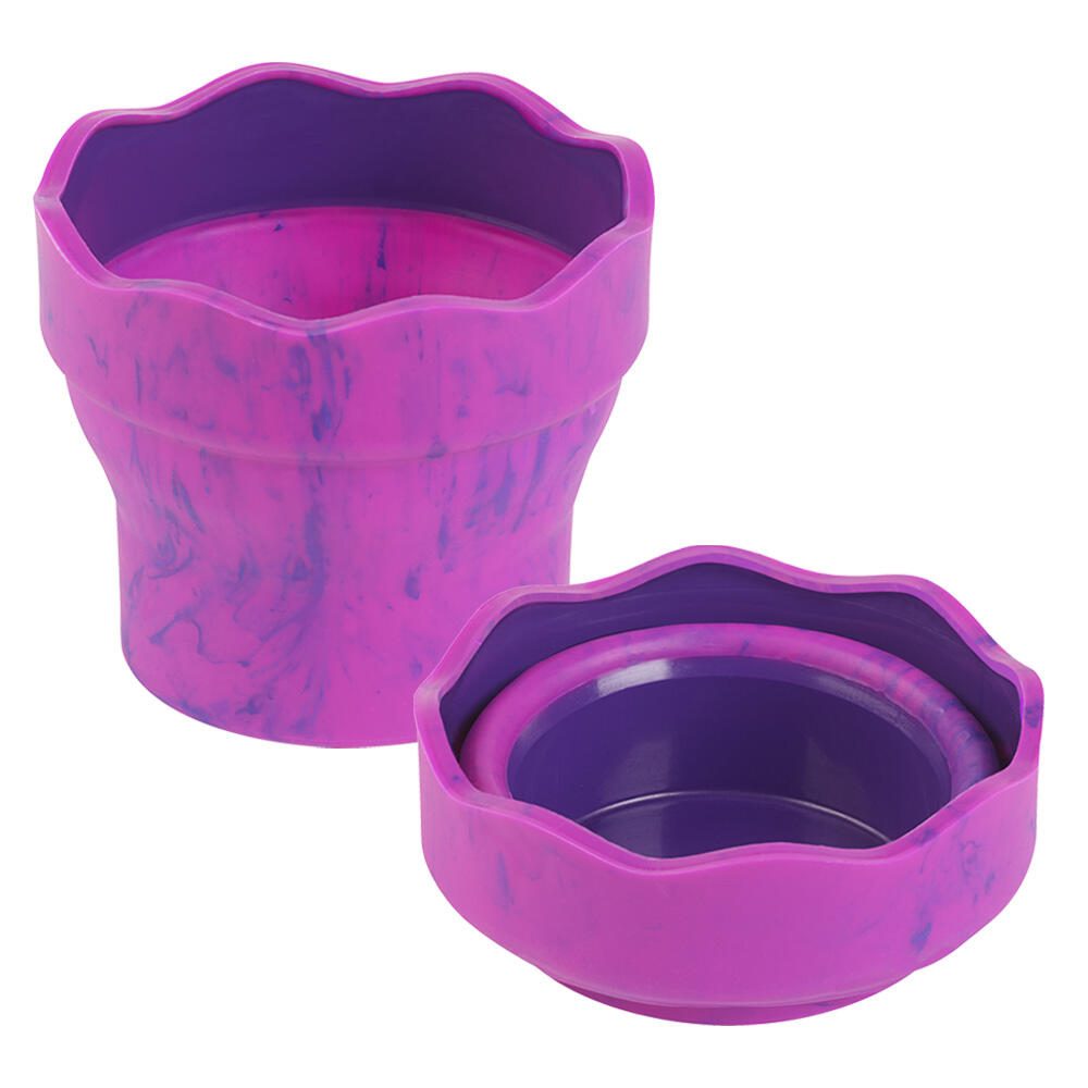 Der FABER-CASTELL Wasserbecher Clic & Go in der Farbvariante pink marble ist ein praktisches Utensil zum einfachen Verstauen und Transportieren. Er gehört zur Serie „Clic & Go“ und zeichnet sich durch einen funktionalen Faltmechanismus aus, der das Volumen des Bechers reduziert und so Platz spart. Dieses Design macht ihn besonders geeignet für den Einsatz unterwegs oder für den Schulalltag.