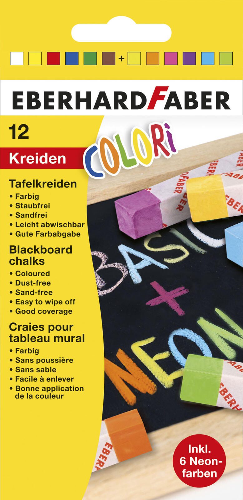 Die EBERHARD FABER Kreide Mehrfarbig ist die perfekte Wahl für kreative Köpfe und kleine Künstler. Diese hochwertige Tafelkreide überzeugt durch ihre vielfältigen Farben und die einfache Handhabung. Mit einer Auswahl an Farben wie Weiß, Gelb, Rot, Blau, Grün, Braun sowie leuchtenden Neonfarben wie Neon-Gelb, Neon-Orange, Neon-Pink, Neon-Violett, Neon-Blau und Neon-Grün kannst du deiner Kreativität freien Lauf lassen und beeindruckende Kunstwerke auf Tafeln oder anderen Oberflächen gestalten.
