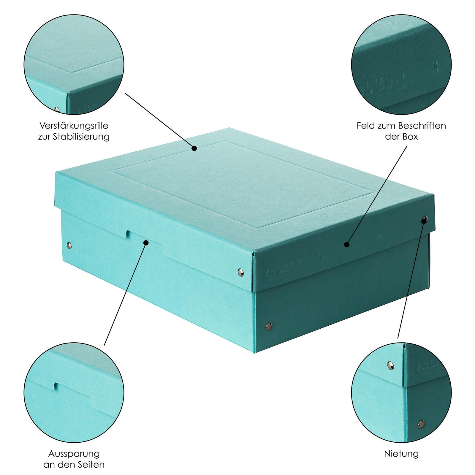 Die FALKEN PURE Aufbewahrungsbox in elegantem Pastellblau ist eine praktische Lösung zur ordentlichen Aufbewahrung von Dokumenten, Fotos, Schmuck und anderen persönlichen Gegenständen. Mit den Außenmaßen von 24,0 x 32,0 x 10,0 cm bietet sie ausreichend Platz für bis zu 1250 Blatt im Format DIN A4 und sorgt so für eine übersichtliche Organisation Ihrer Unterlagen.