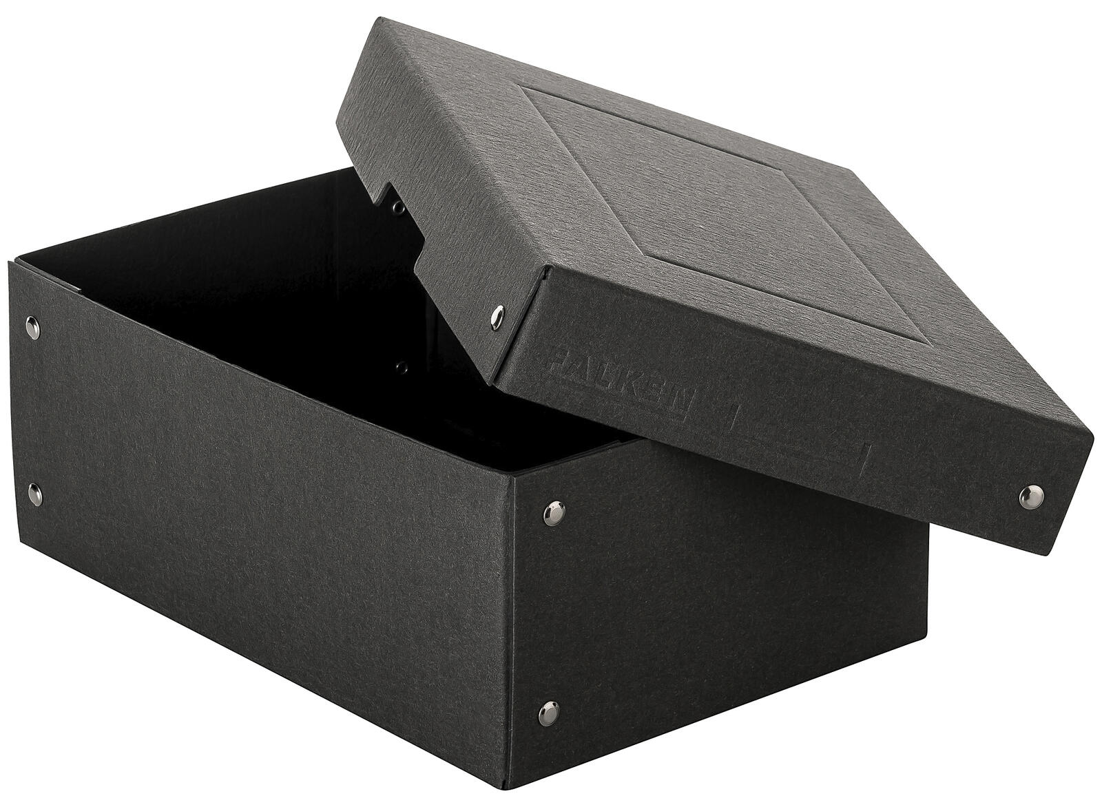 - Besonderheiten: Box mit Deckel aus hochwertigem Recycling-Karton (Buchbinderpappe), genietet, mit Beschriftungsfeld und Griffaussparung