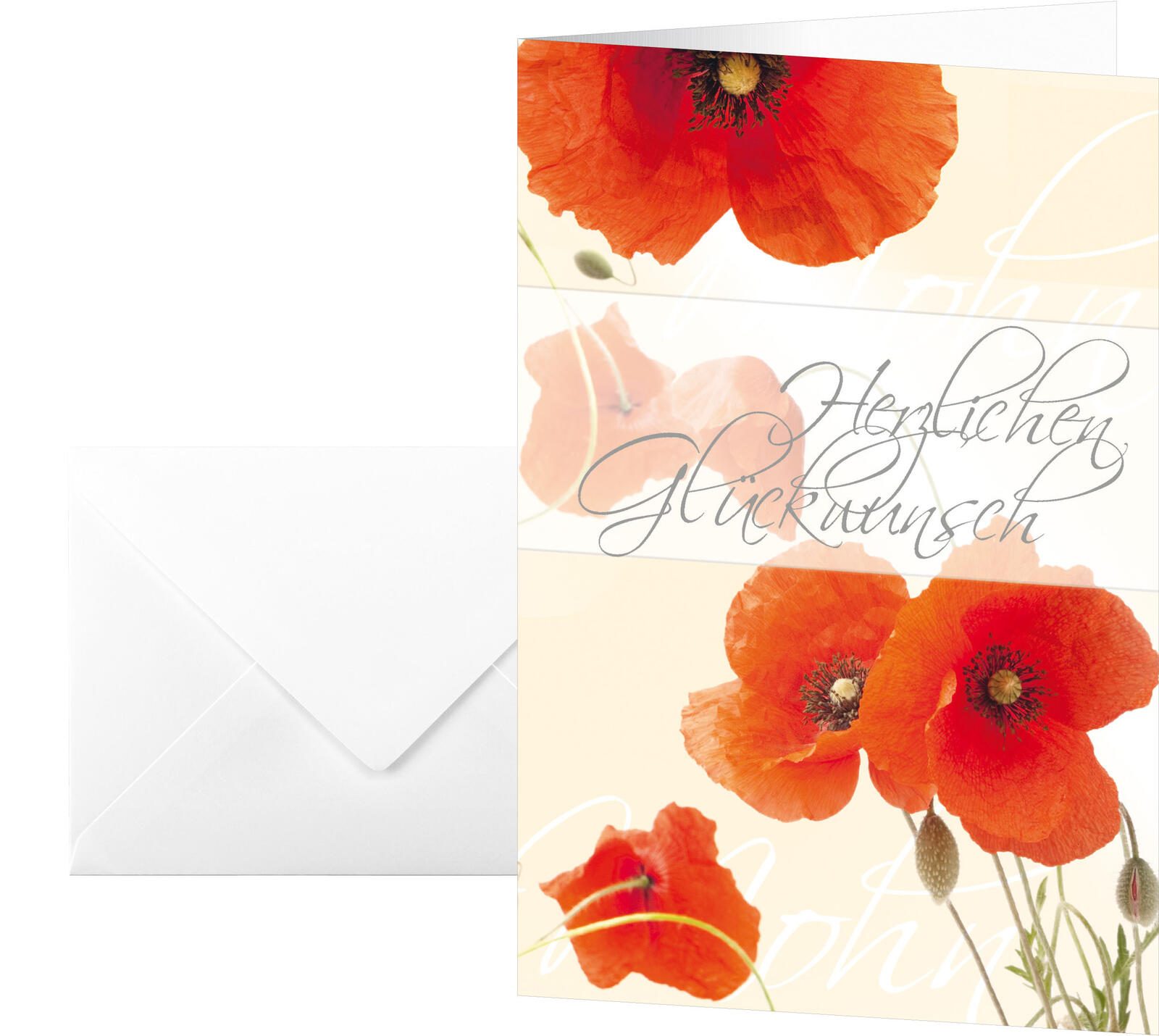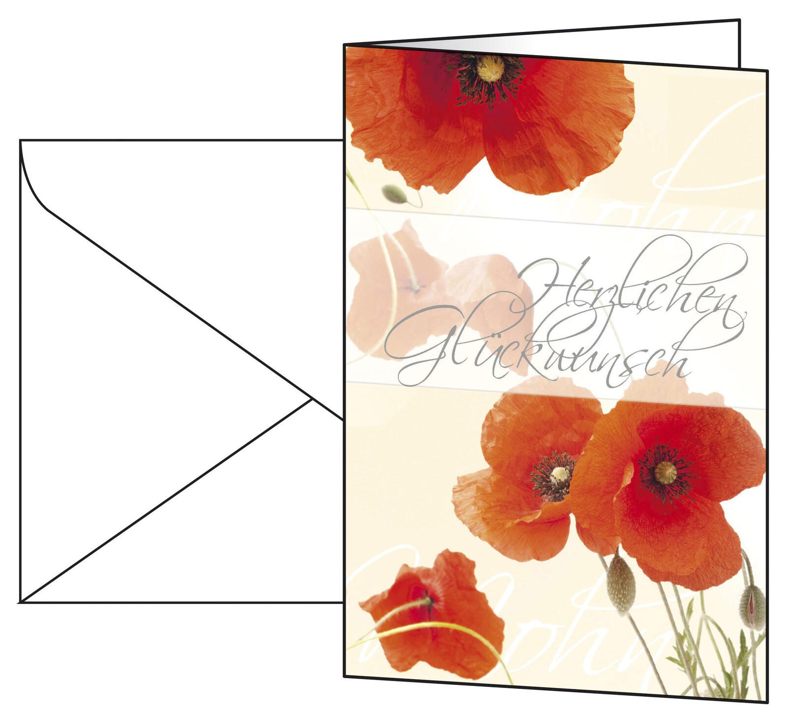 Die SIGEL Glückwunschkarten Red Poppies im praktischen DIN A6 Format sind die perfekte Wahl, um Deine herzlichen Grüße stilvoll zu übermitteln. Mit einem ansprechenden Motiv von leuchtenden roten Mohnblumen verleihen diese Karten jedem Anlass einen besonderen Charme. Sie sind nicht nur optisch ansprechend, sondern auch äußerst funktional. Jede Packung enthält 10 Karten, die mit weißen Umschlägen geliefert werden, sodass Du sofort bereit bist, Deine Botschaft zu versenden. Die Karten bestehen aus hochwertigem Glanzkarton mit einem Papiergewicht von 220 g/m², was ihnen eine edle Haptik und Stabilität verleiht. Zudem sind sie umweltfreundlich, da sie holzfrei und elementar chlorfrei gebleicht (ECF) sind. Dies macht sie zu einer nachhaltigen Wahl für umweltbewusste Verbraucher. Du kannst die Karten ganz nach Deinen Wünschen gestalten, denn sie sind bedruckbar mit Laser-, Inkjet-Druckern sowie Kopierern. So kannst Du persönliche Botschaften oder kreative Designs hinzufügen, um Deine Glückwünsche noch individueller zu gestalten. Mit den Maßen von 11,5 x 17,0 cm bieten die Karten ausreichend Platz für Deine Gedanken und Wünsche. Die SIGEL Glückwunschkarten Red Poppies sind ideal für verschiedene Anlässe, sei es zu Geburtstagen, Hochzeiten oder einfach nur, um jemandem eine Freude zu bereiten. Die Kombination aus ansprechendem Design und vielseitigen Nutzungsmöglichkeiten macht diese Karten zu einem unverzichtbaren Begleiter in Deinem Schreibwarenarsenal. Verleihe Deinen Glückwünschen eine persönliche Note und erfreue Deine Liebsten mit diesen wunderschönen Karten.Technische Daten