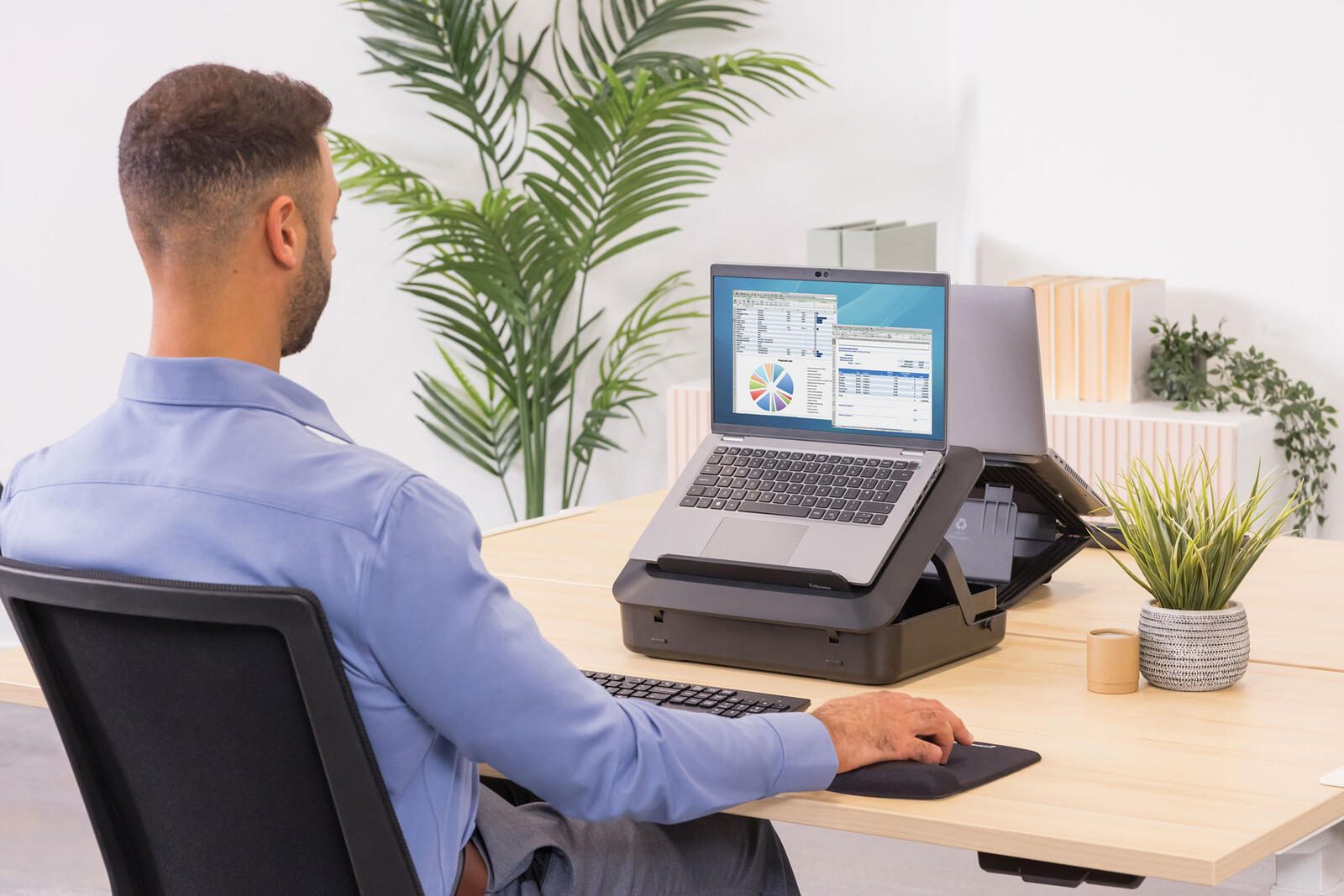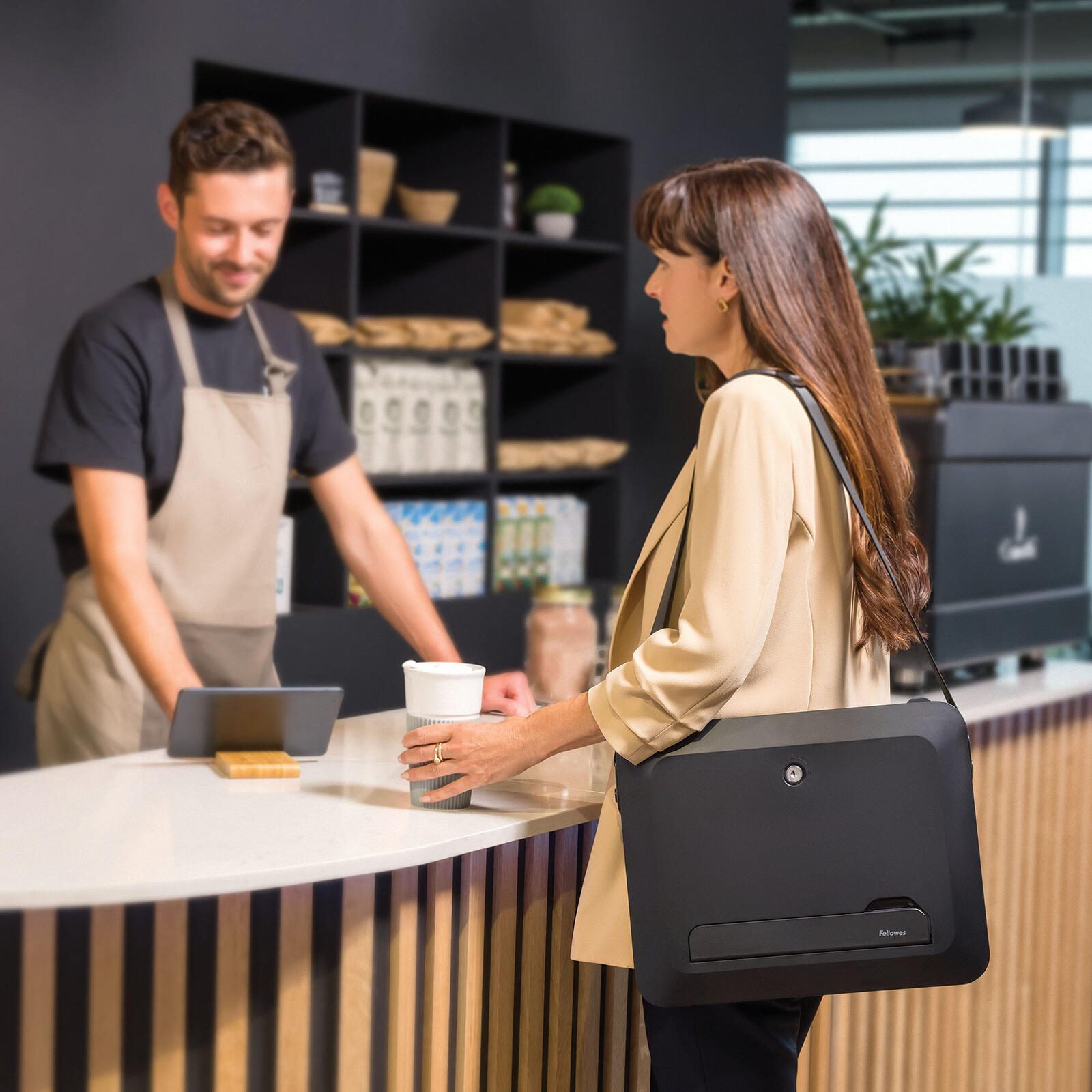 Die Fellowes Laptoptasche Breyta Toolbox in elegantem Schwarz ist die perfekte Lösung für alle, die viel unterwegs sind und ihren Laptop sicher transportieren möchten. Diese vielseitige 2-in-1-Tasche dient sowohl als Aufbewahrungslösung als auch als praktischer Laptop-Ständer, der dir fünf verschiedene Höheneinstellungen bietet. So kannst du deinen Laptop immer in der optimalen Position nutzen, egal ob im Café oder im Büro.