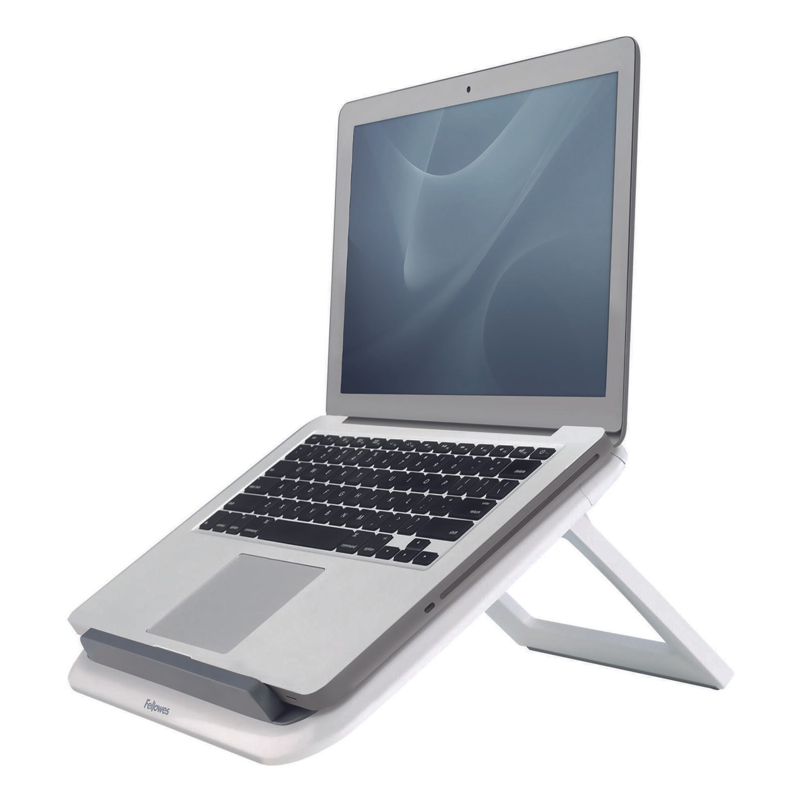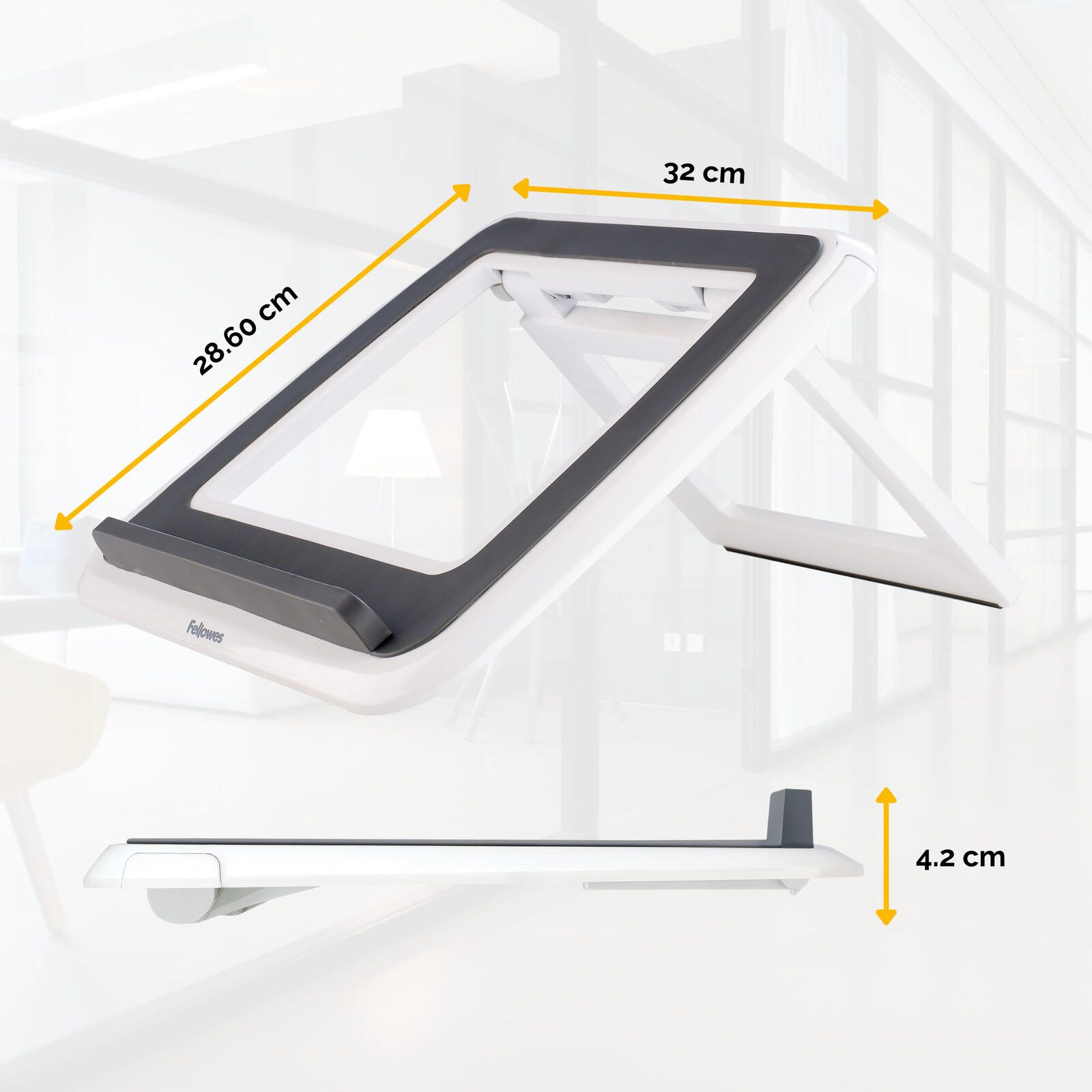 Der Fellowes Notebook-Ständer in elegantem Weiß vereint Funktionalität und modernes Design. Hergestellt aus hochwertigem Kunststoff und Metall, bietet dieser Ständer eine beeindruckende Tragkraft von bis zu 4 kg, was ihn ideal für Notebooks bis zu einer Größe von 43,2 cm (17 Zoll) macht. Mit kompakten Abmessungen von 32,0 x 28,6 x 4,2 cm ist er sowohl platzsparend als auch stabil und passt perfekt auf jeden Schreibtisch.