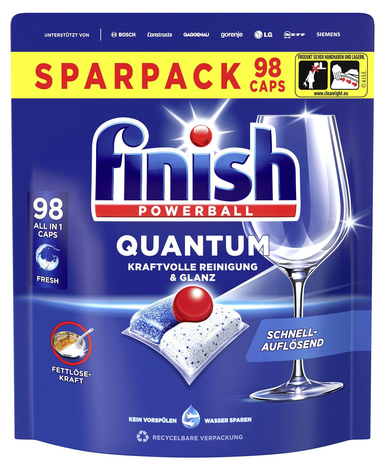 Die finish Spülmaschinentabs POWERBALL QUANTUM ALL IN 1 bieten eine kraftvolle Reinigung für Deine Geschirrspülmaschine. Mit insgesamt 98 Tabs in der Packung sind sie für eine lange Nutzung ausgelegt und sorgen zuverlässig für sauberes und glänzendes Geschirr. Die Tabs sind speziell für den Einsatz in Geschirrspülmaschinen entwickelt und vereinfachen die Reinigung durch ihre praktische Handhabung.