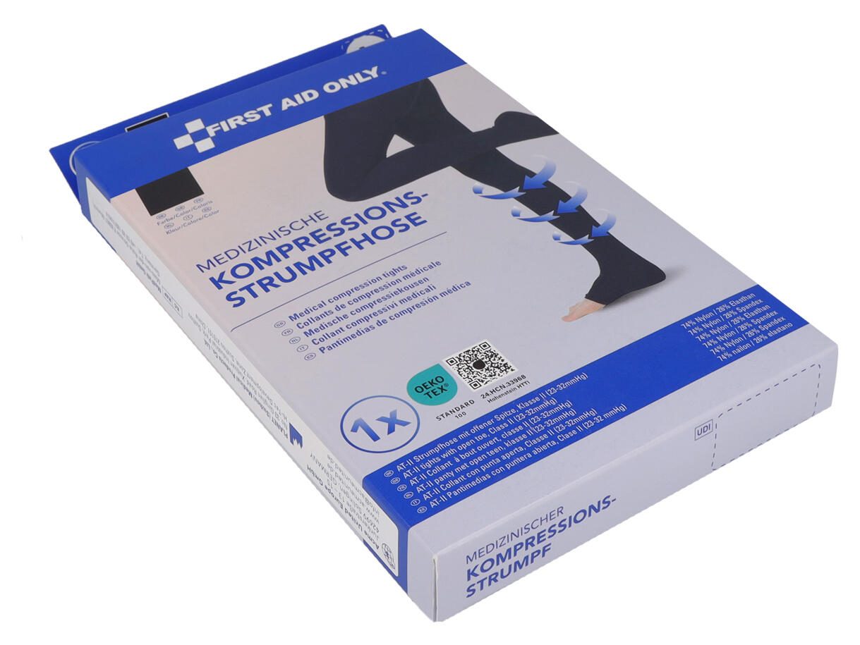 Die FIRST AID ONLY® Kompressionsstrumpfhose in der Farbe Schwarz ist speziell für den unisex Gebrauch konzipiert und eignet sich durch ihre offene Spitze besonders für alle, die eine Kombination aus Komfort und Funktionalität suchen. Sie ist in der Größe S/M erhältlich und bietet eine passgenaue Passform für verschiedene Fußgrößen.