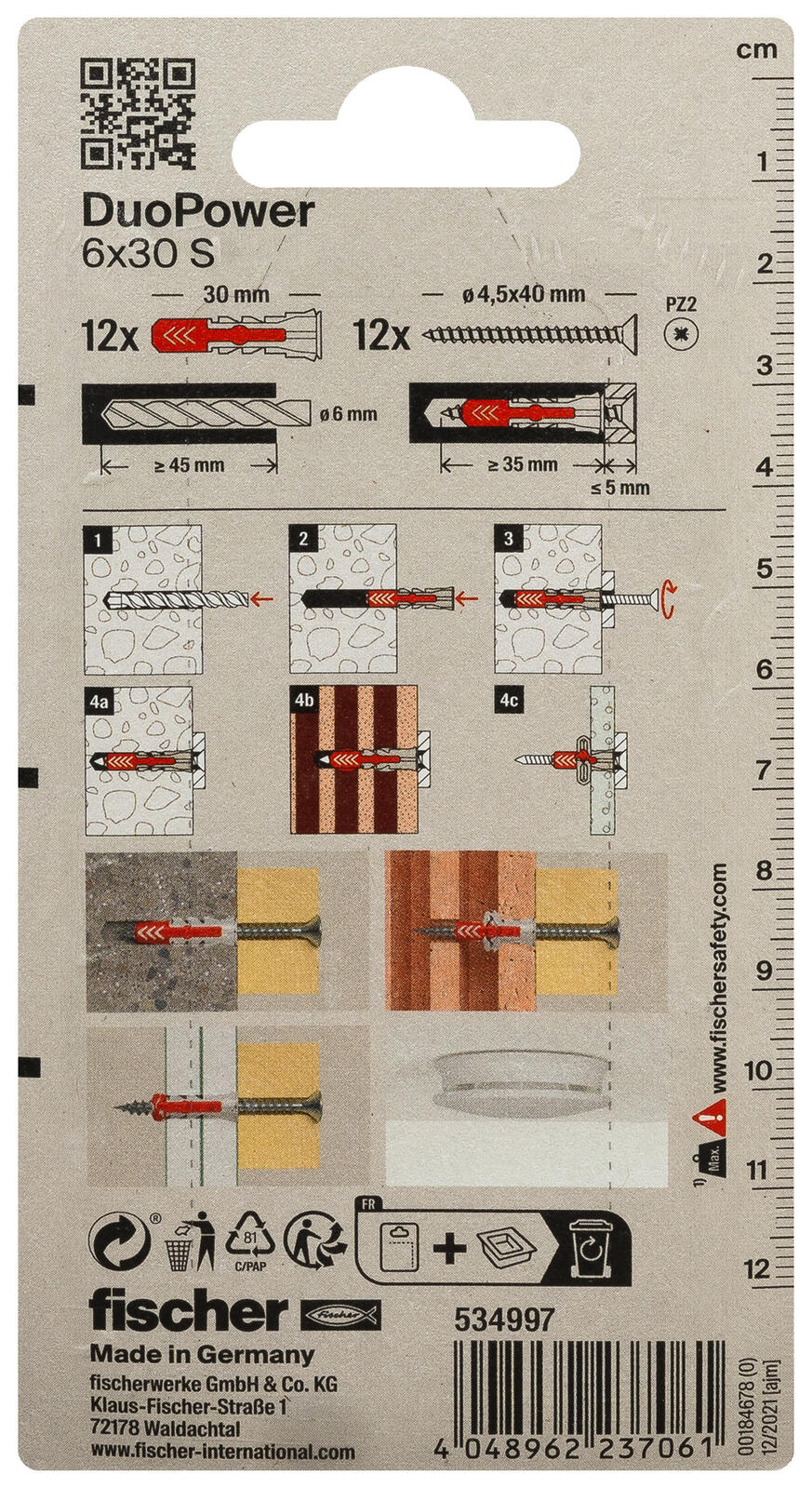 fischer DuoPower 6x30 S Dübel mit Schrauben 6 x 30 mm, 12 Stück