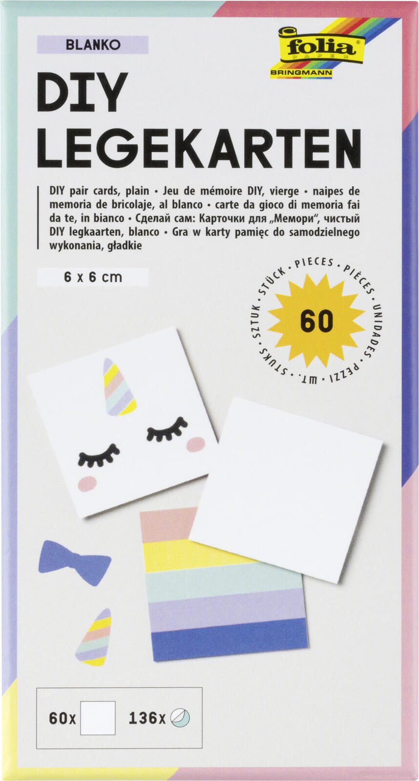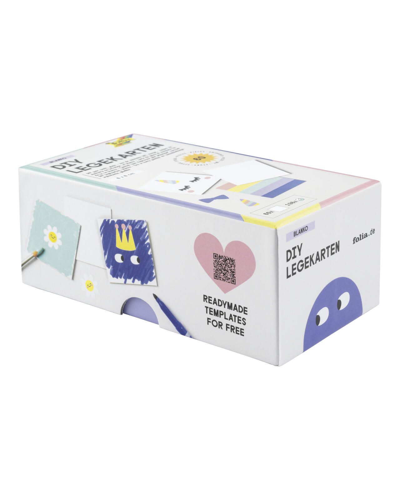 Das folia Bastelset Blanko DIY Legekarten blanko bietet eine kreative Grundlage für individuelle Bastelprojekte. Es enthält 60 Karten im Format 6,0 x 6,0 cm, die unbedruckt und somit frei gestaltbar sind. Zusätzlich liegen 136 Sticker bei, die zur Dekoration oder Personalisierung der Karten verwendet werden können. Ein QR-Code ermöglicht den einfachen Zugriff auf Vorlagen, die heruntergeladen und als Inspiration oder Anleitung genutzt werden können.