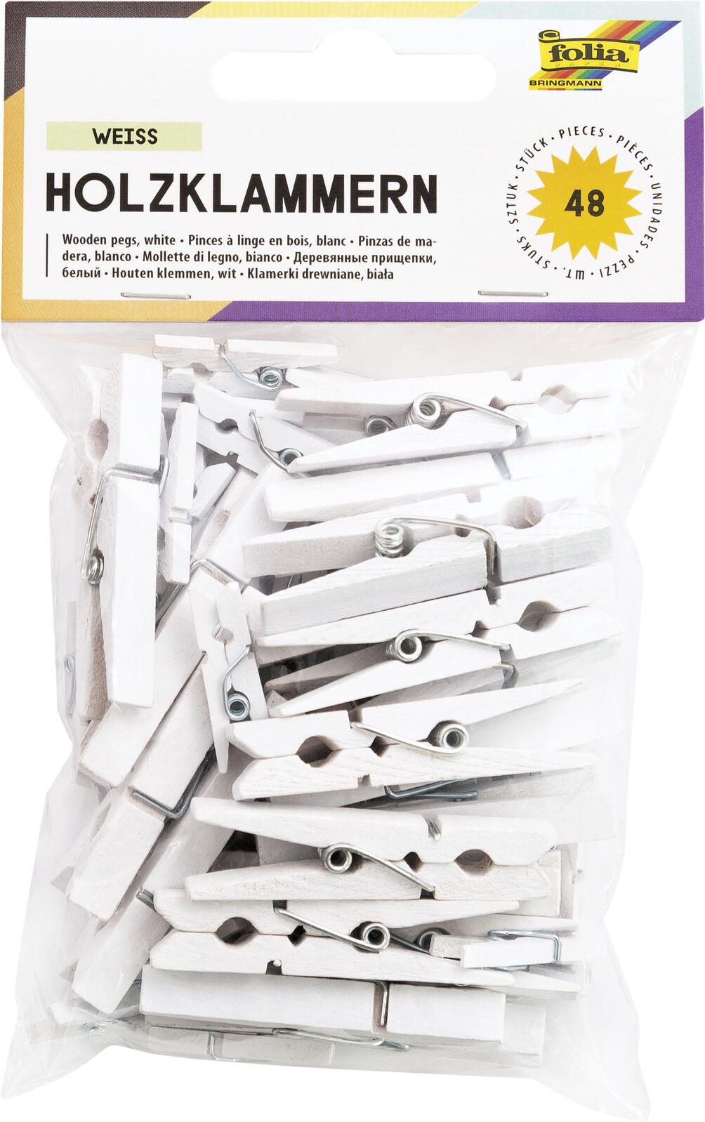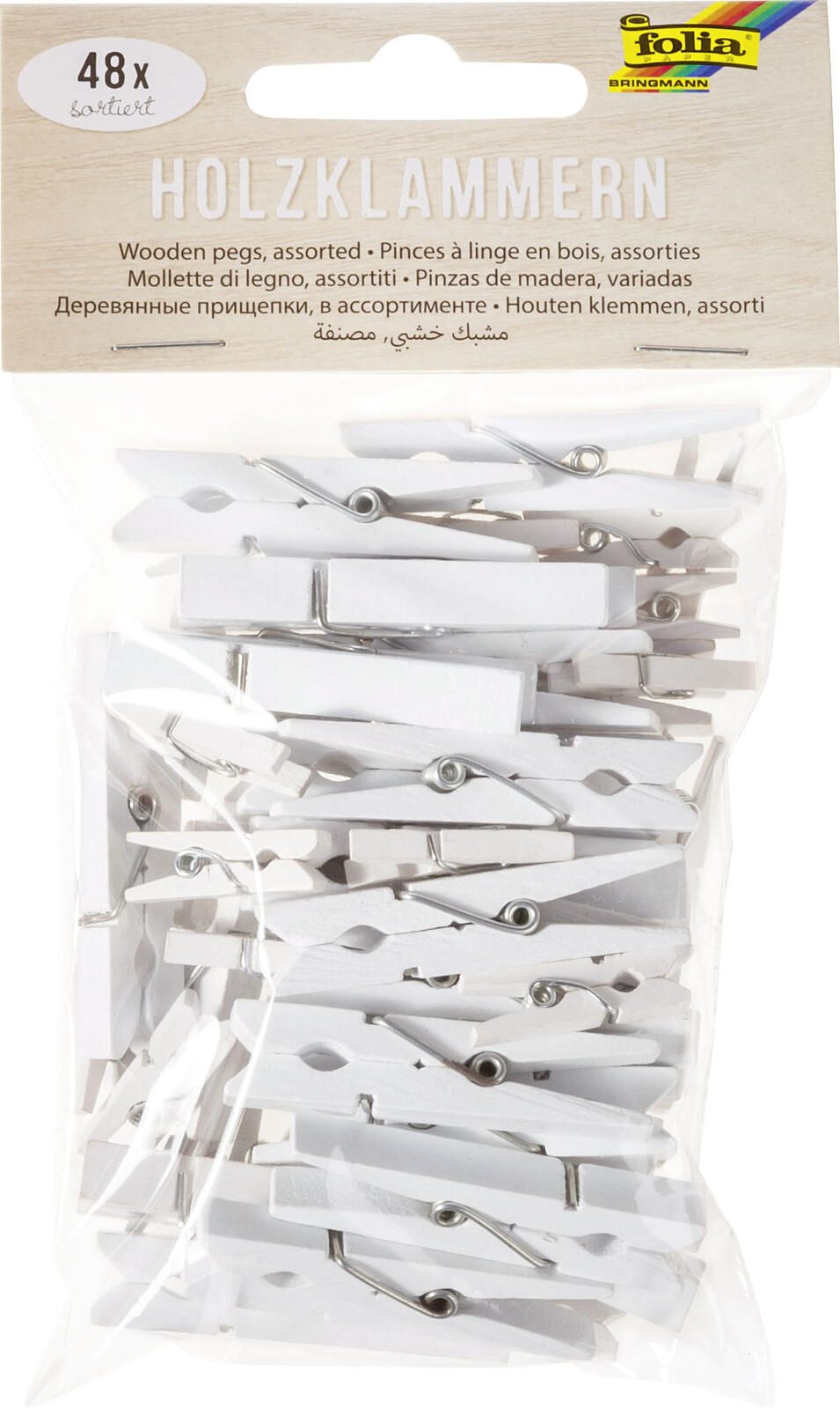 - Besonderheiten: Holzklammern weiß in 3 Größen sortiert: 48x7mm - 23 Stück, 35x7mm - 3 Stück, 25x3mm - 22 Stück