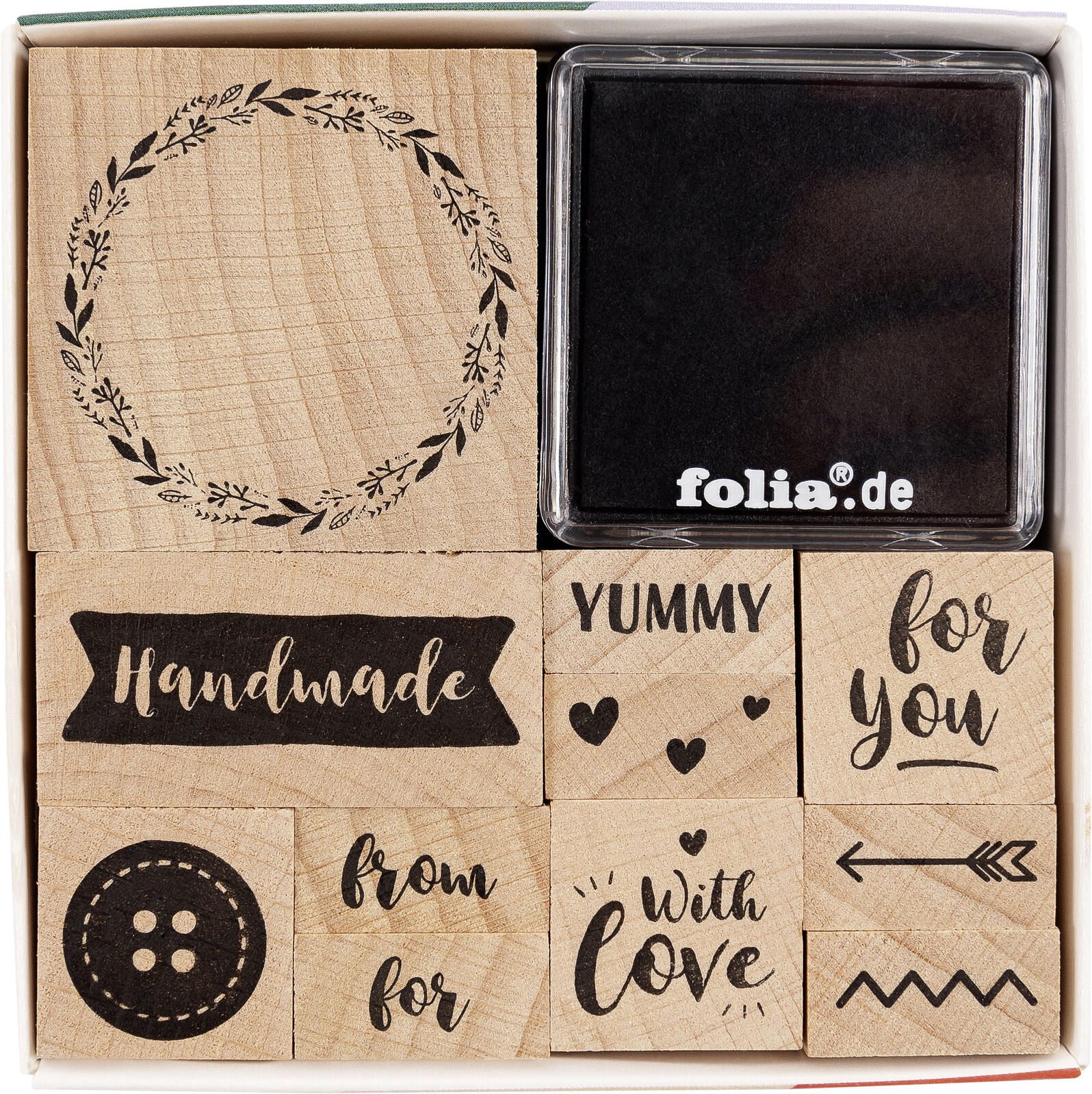 Das folia Motivstempel-Set HANDMADE ist die perfekte Wahl für kreative Bastler und DIY-Enthusiasten. Hergestellt aus hochwertigem Holz, vereint dieses Set sowohl Funktionalität als auch ansprechendes Design. Mit dem eingravierten Motiv "HANDMADE" können Sie Ihren Projekten eine persönliche Note verleihen und Ihre Kunstwerke individuell gestalten.
