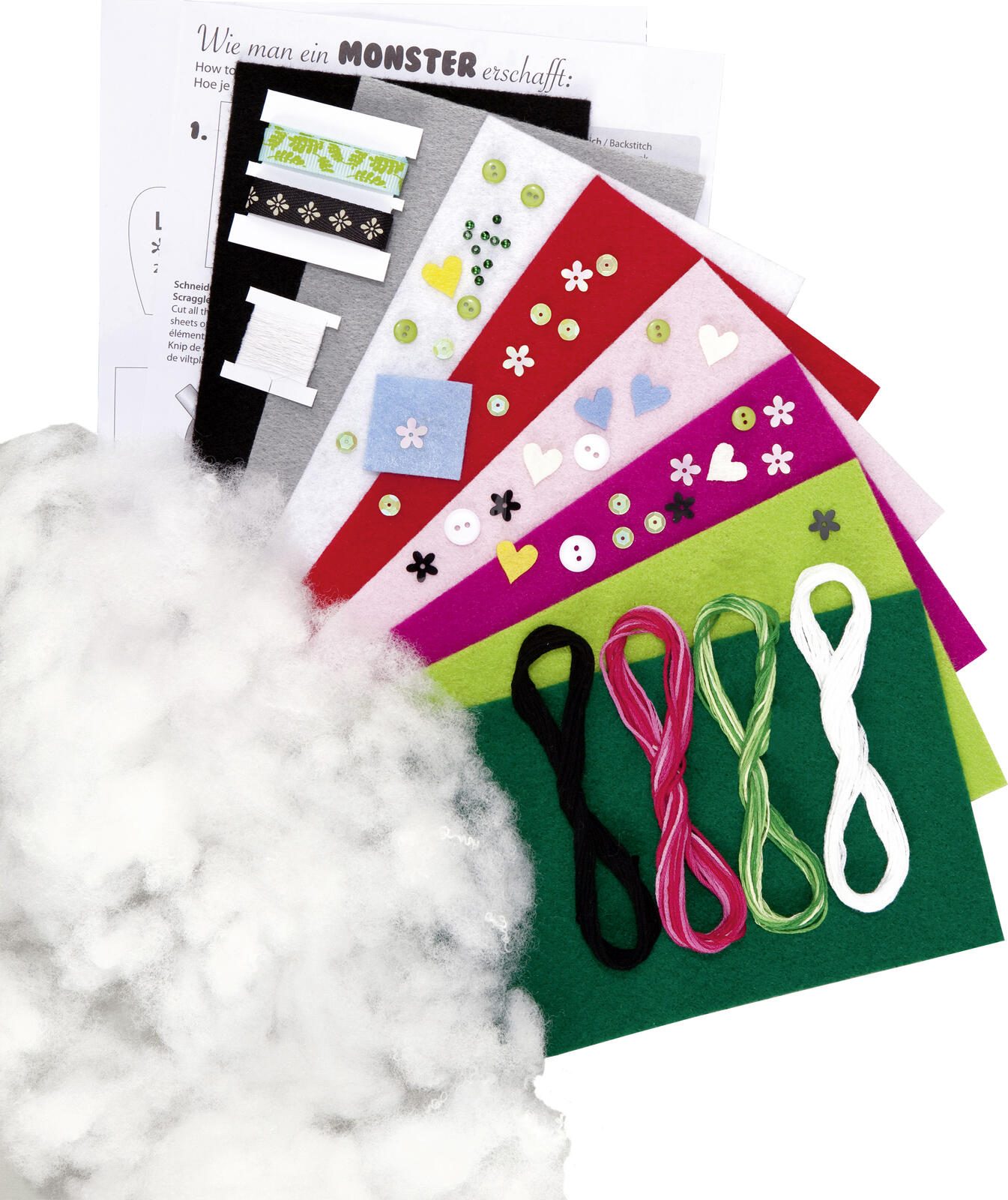 • Setumfang: Filz, Füllwatte, Stickgarn, Bänder, Dekoteile, Bastelanleitung, Schnittmuster