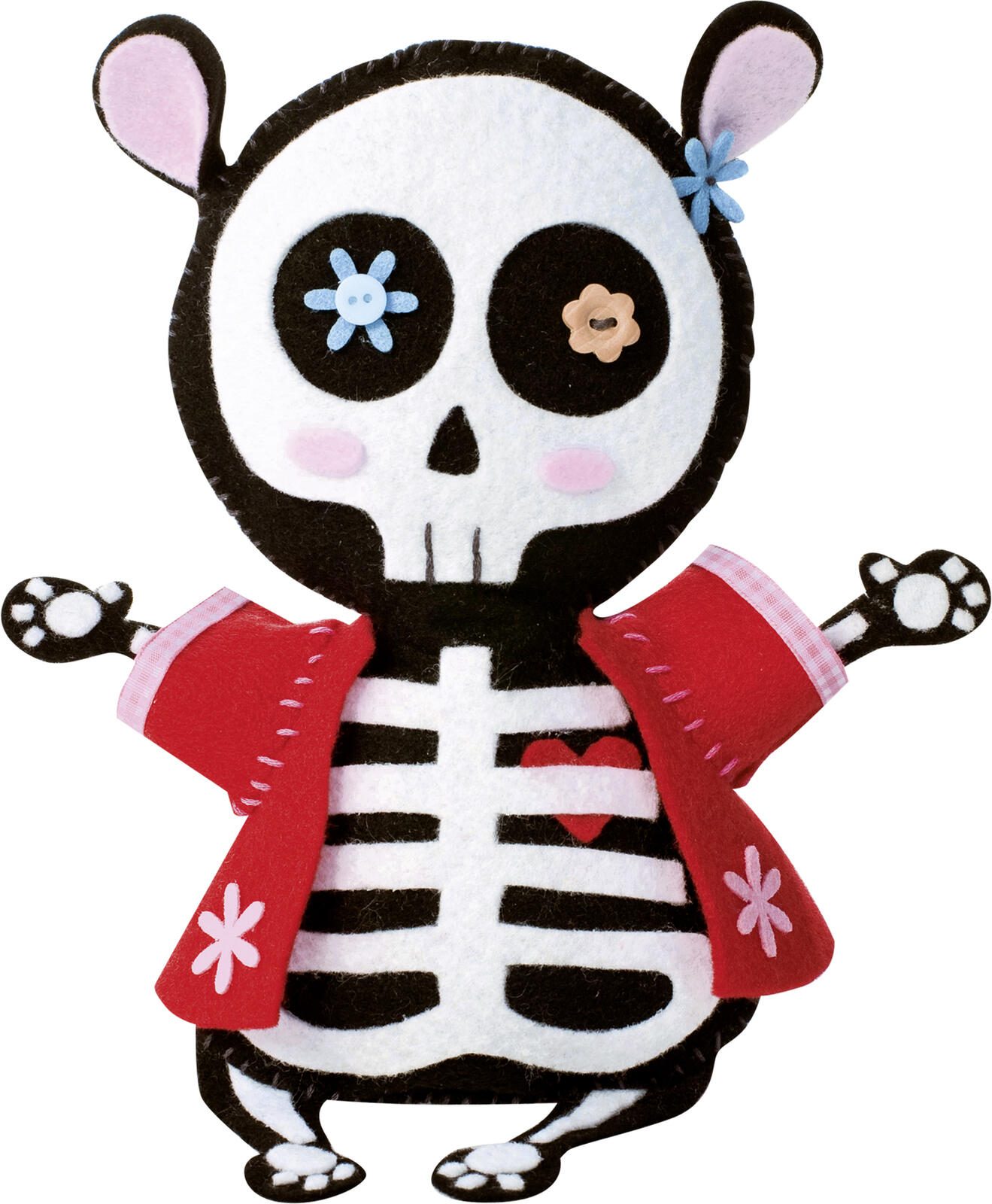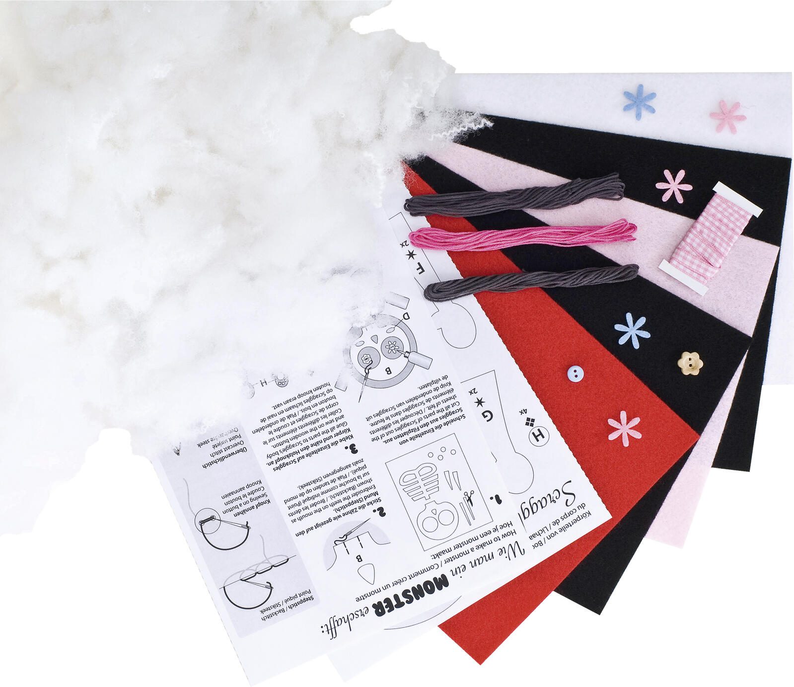 - Setumfang: Filz, Faden, Knöpfe, verschiedene Applikationen, Bastelanleitung, Schnittmuster