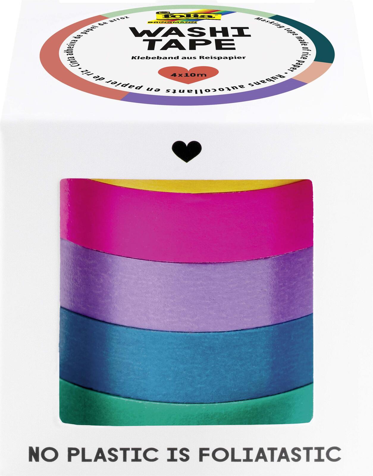 Das folia Deko-Klebeband ist die ideale Wahl für kreative Bastelprojekte und das individuelle Gestalten von Geschenken oder Dekorationen. Mit einer Breite von 10 mm und einer Länge von 10 m bietet es ausreichend Material, um deiner Kreativität freien Lauf zu lassen. Das Klebeband ist in fünf ansprechenden Farben erhältlich: gelb, pink, lila, blau und grün, die alle in einem matten Finish gehalten sind und somit einen eleganten Look verleihen. Die Eigenschaften des folia Deko-Klebebands machen es besonders vielseitig einsetzbar. Es ist ablösbar, was bedeutet, dass du es problemlos wieder entfernen kannst, ohne Rückstände zu hinterlassen. Zudem ist es beschreibbar, sodass du persönliche Notizen oder Botschaften direkt auf das Band schreiben kannst. Das von Hand einreißbare Material ermöglicht es dir, das Klebeband schnell und einfach in der gewünschten Länge zu nutzen, ohne dass du eine Schere benötigst. Hergestellt aus hochwertigem Reispapier, ist das Klebeband nicht nur umweltfreundlich, sondern auch leicht und flexibel, was es ideal für verschiedene Basteltechniken macht. Ob du Scrapbooking, Karten gestalten oder einfach nur deine Wohnräume dekorieren möchtest, dieses Deko-Klebeband ist der perfekte Begleiter für alle kreativen Köpfe. Ein Pack enthält fünf Rollen, sodass du genügend Material zur Verfügung hast, um deine Ideen zu verwirklichen. Das folia Washi-Tape colour basic ist ein unverzichtbares Werkzeug für jeden Bastelenthusiasten, der Wert auf Qualität und Vielfalt legt. Lass deiner Fantasie freien Lauf und entdecke die Möglichkeiten, die dir dieses farbenfrohe Deko-Klebeband bietet.Technische Daten